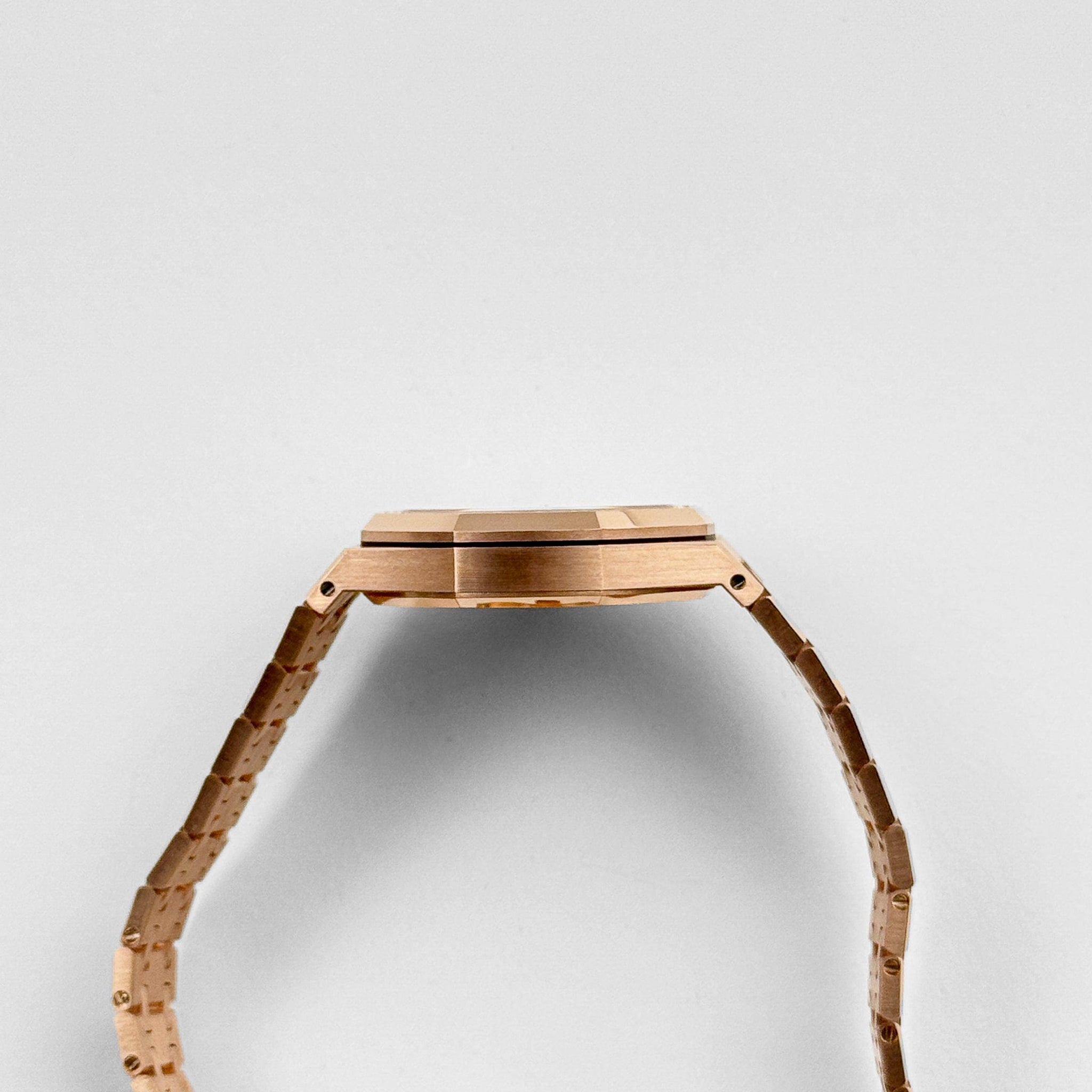 Its silver-toned "Grande Tapisserie" dial is accented by rose gold applied hour markers and Royal Oak hands with luminescent coating, delivering legibility and elegance in equal measure. Paired with a full 18k rose gold bracelet featuring AP’s signature folding clasp, the watch merges jewelry-like sophistication with everyday wearability. A luxurious and timeless expression of the Royal Oak legacy.