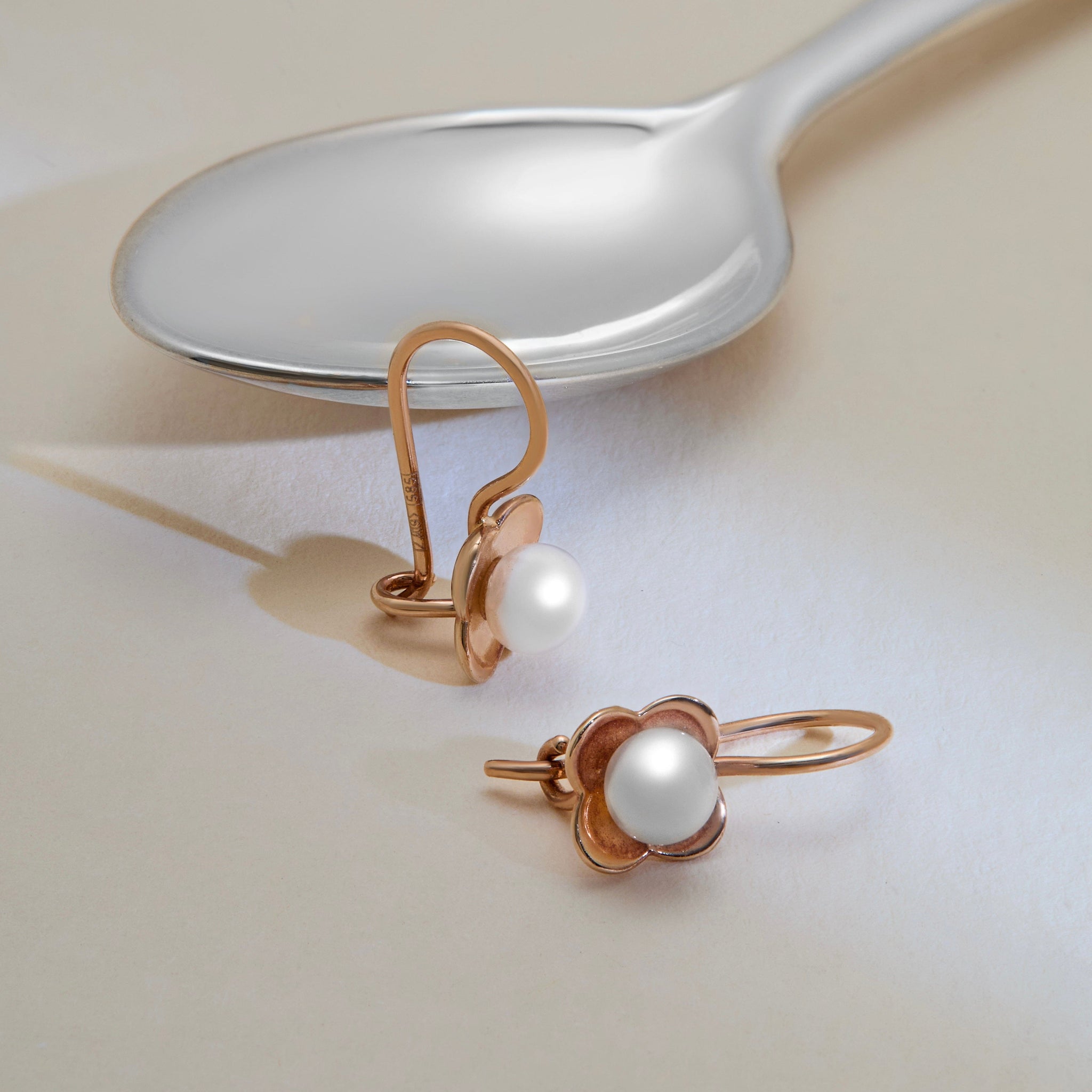 Delicate and timeless, the Baby Pearl Flower Earrings are handcrafted in 14K rose gold with luminous white pearls set in petite floral silhouettes. Designed with European hoops for a secure and gentle fit, these earrings combine comfort and elegance. A classic choice in fine baby jewelry, perfect for everyday wear or gifting.