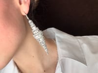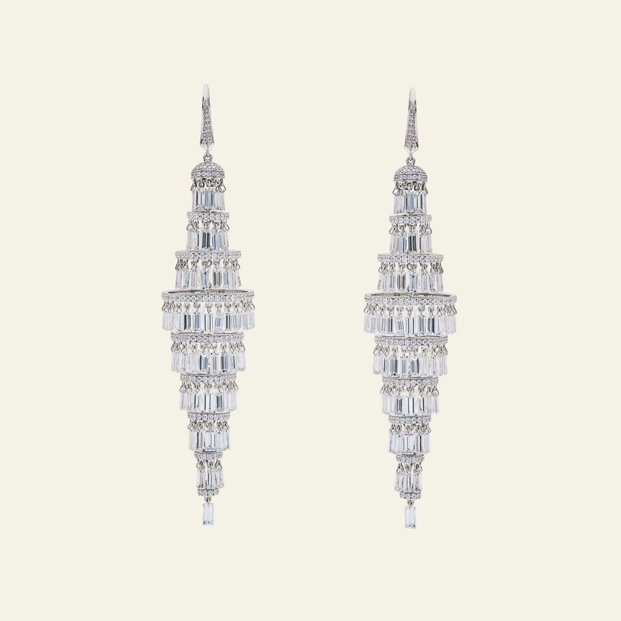 An elegant expression of high jewelry craftsmanship, these Cascade diamond chandelier earrings are crafted in 18K white gold and designed with a sculptural, tiered silhouette that creates fluid movement and exceptional sparkle. Rows of precision-set dangling diamonds cascade gracefully, catching the light from every angle for a luminous, elongated effect. With their refined diamond dangle earring design and architectural balance, these white gold diamond earrings make a striking high jewelry statement while remaining timeless and impeccably polished.