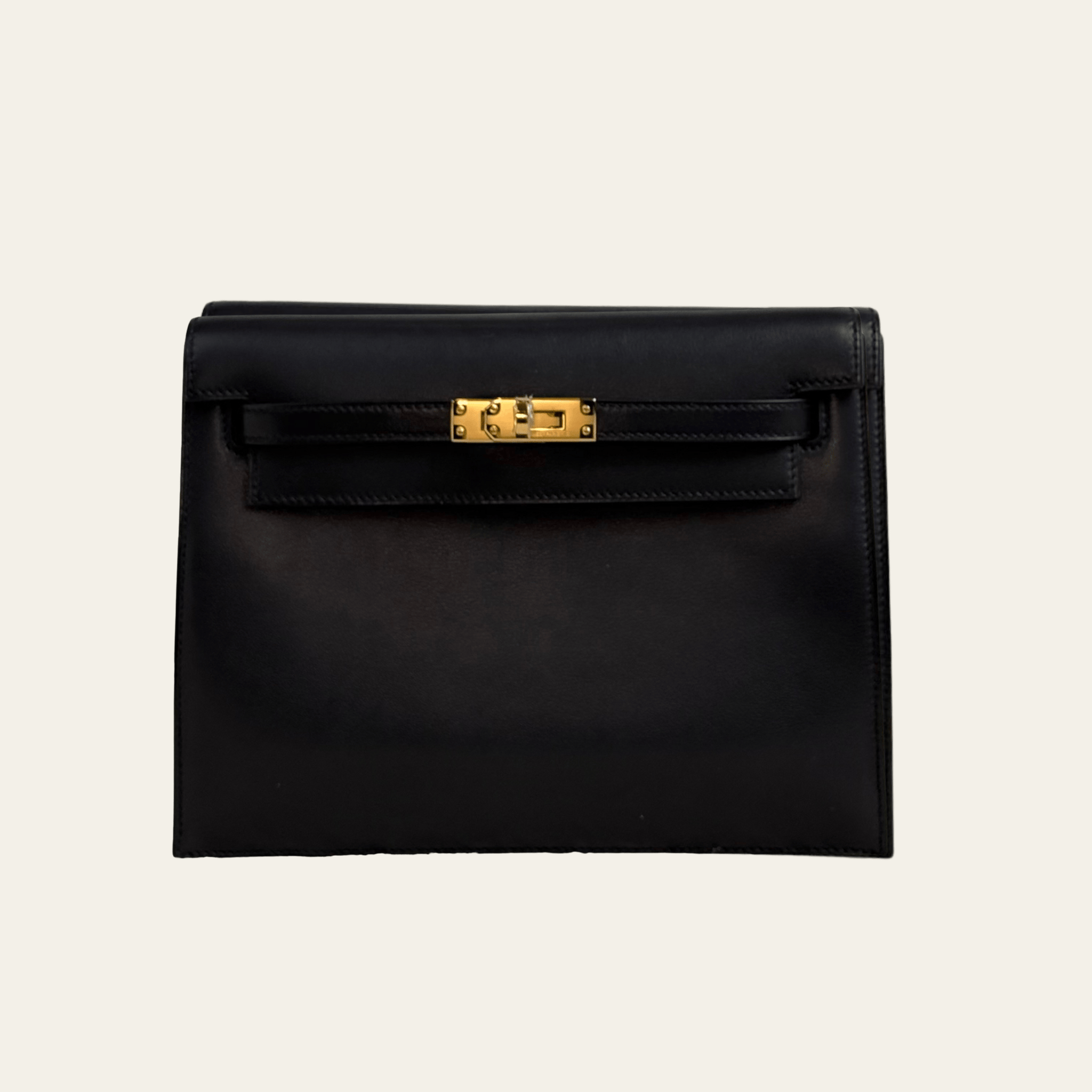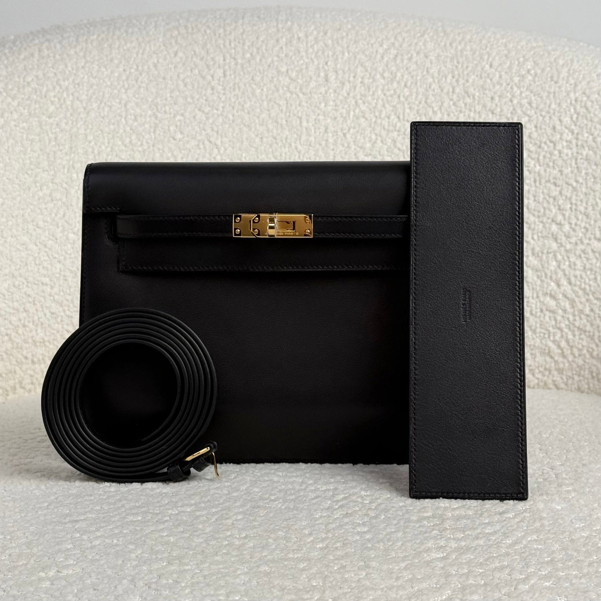 Finished with gold hardware (GHW), this black Kelly Danse features a Volupto interior base insert, designed to reinforce the bottom of the bag and help it maintain its shape over time. This structured insert adds durability and support while preserving the flexibility that defines the Kelly Danse, ensuring a refined silhouette whether worn as a shoulder bag, crossbody, or belt bag. The warm gold hardware adds a classic contrast against the deep black leather, elevating the overall look.