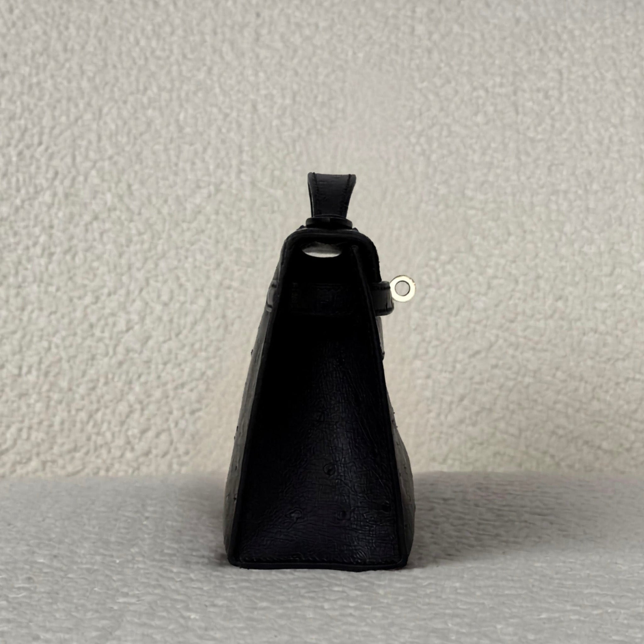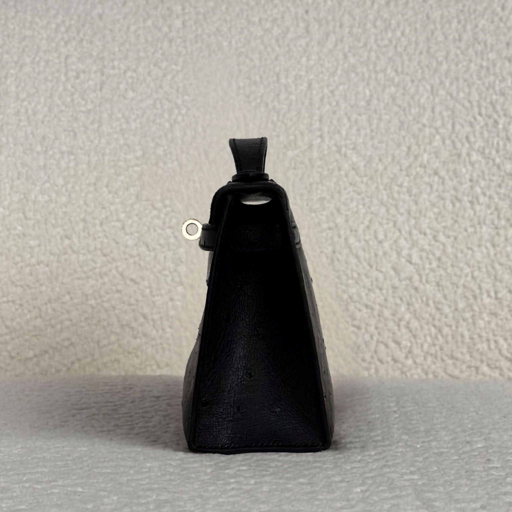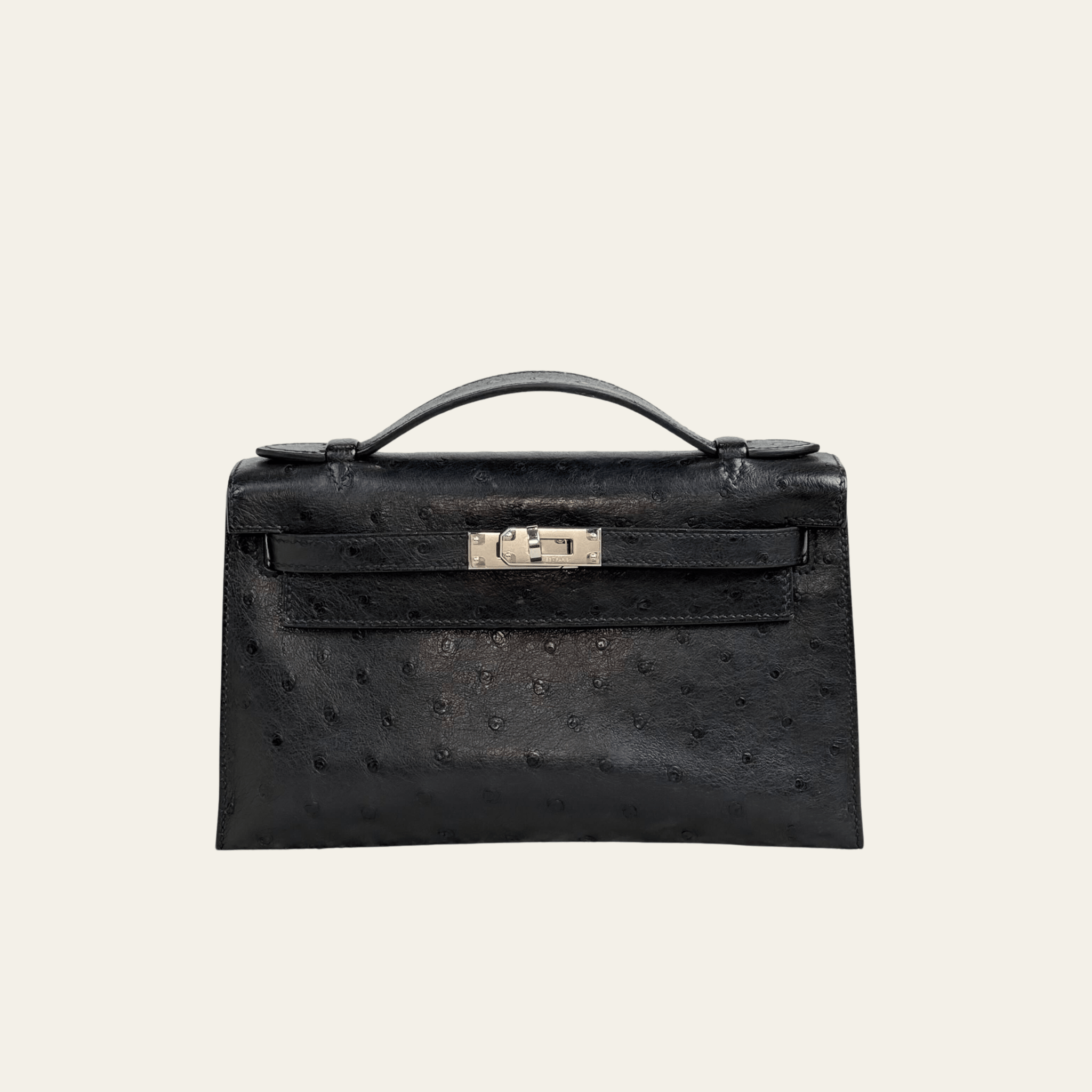 Finished with palladium hardware (PHW), this black Kelly Pochette achieves a sleek and modern contrast that highlights the richness of the ostrich leather beautifully. Slightly larger than a Mini Kelly, the Kelly Pochette offers a more flexible interior that can comfortably accommodate essentials while maintaining its elegant, streamlined profile, making it ideal as a clutch for evening wear or carried casually for daytime sophistication.