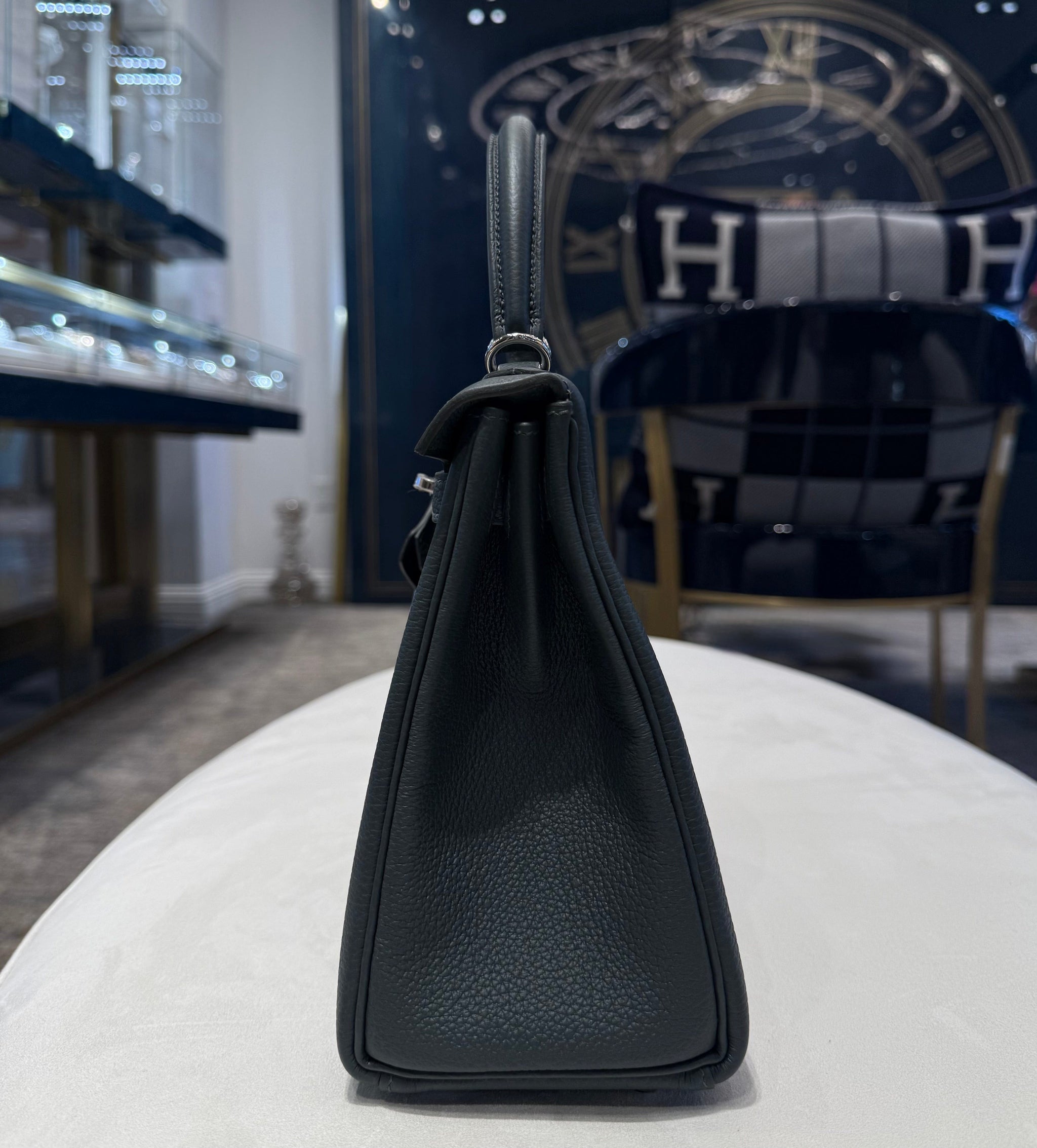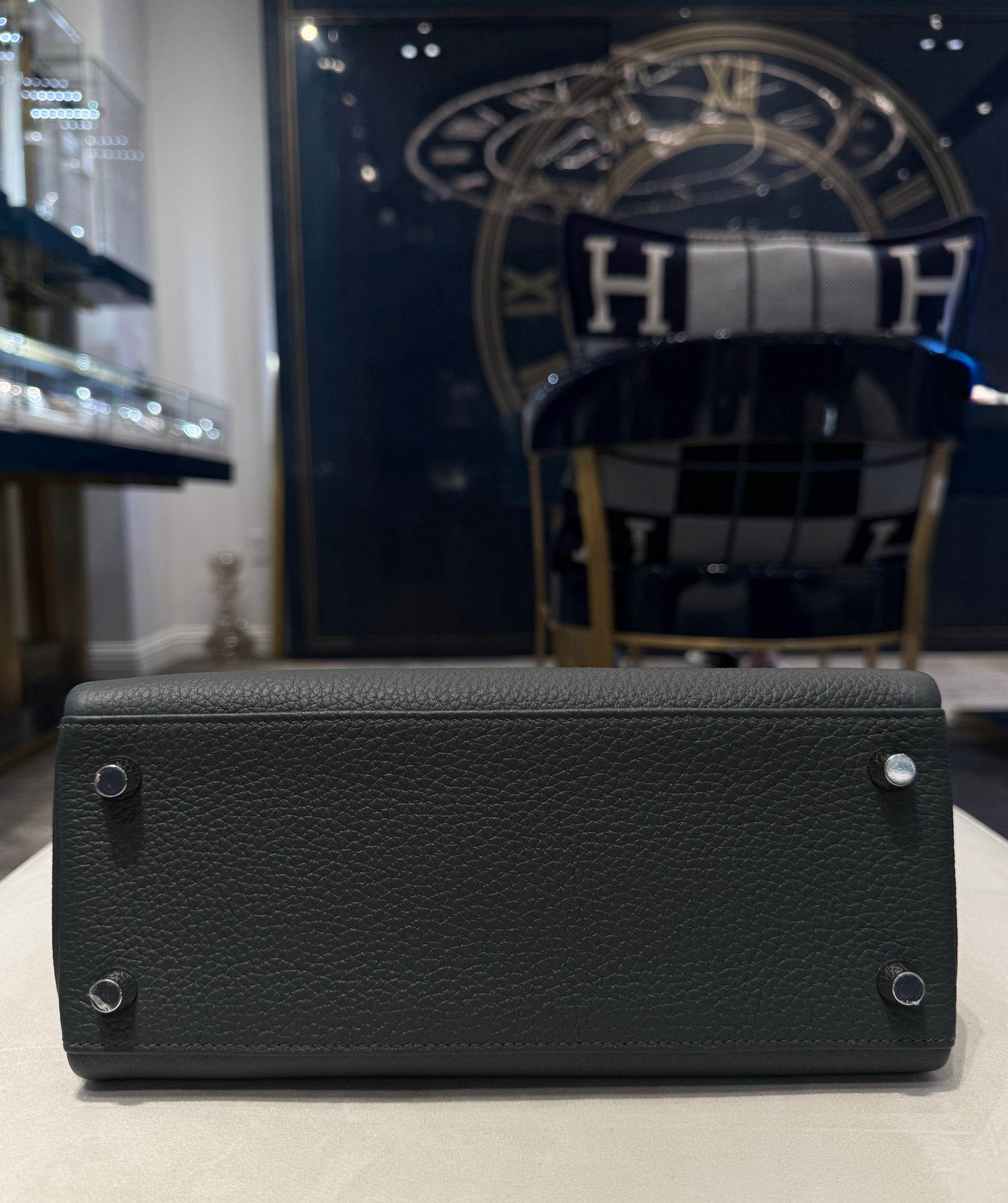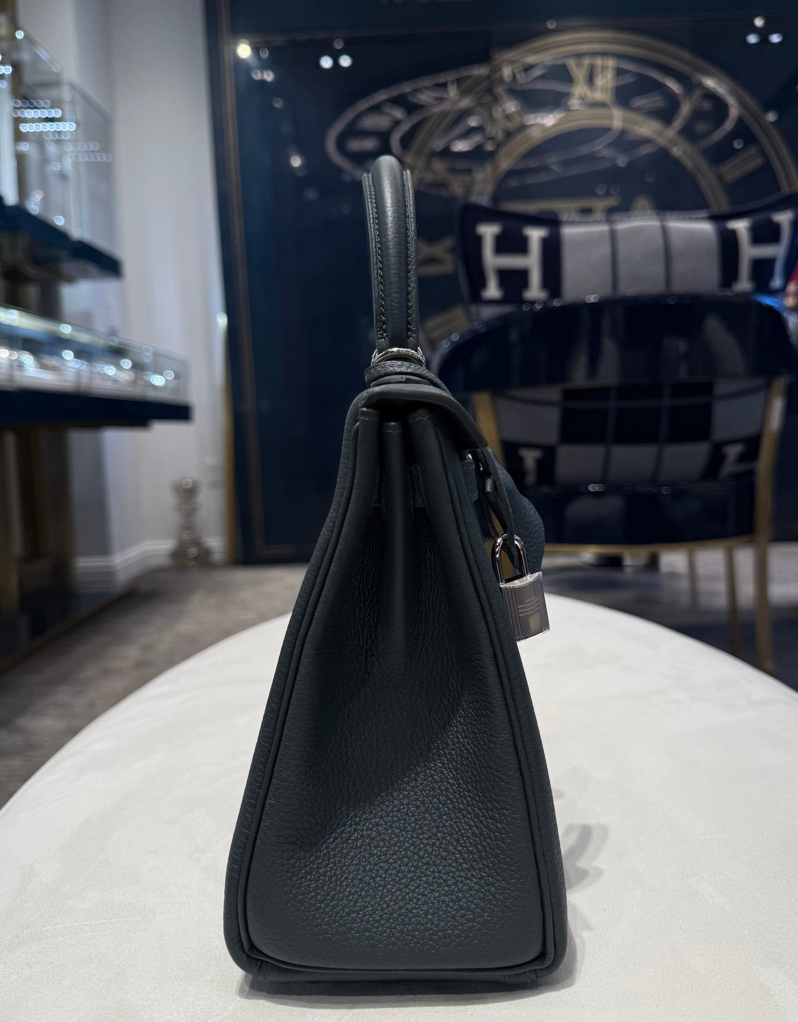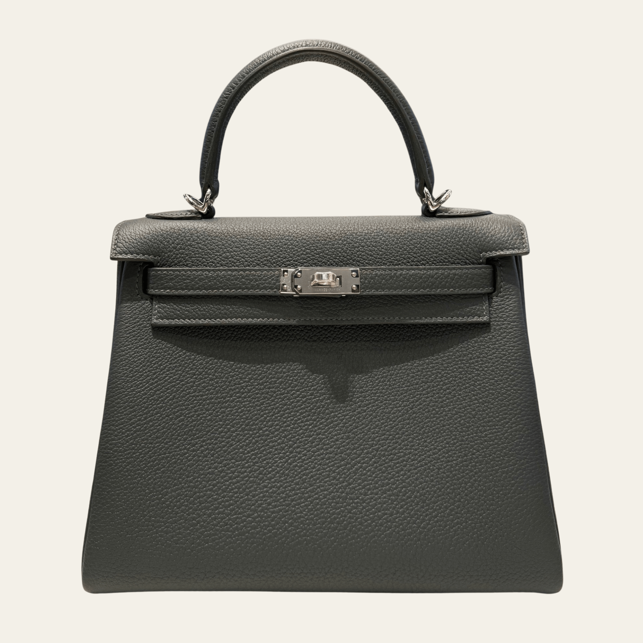Accented with palladium hardware (PHW), this green Kelly 25 achieves a subtle contrast that enhances its contemporary feel. The Retourne style, characterized by its inward stitching and rounded edges, lends a more casual and versatile tone, making it ideal for both everyday wear and polished occasions. With its combination of deep color and timeless craftsmanship, this piece strikes a perfect balance between elegance and modernity.