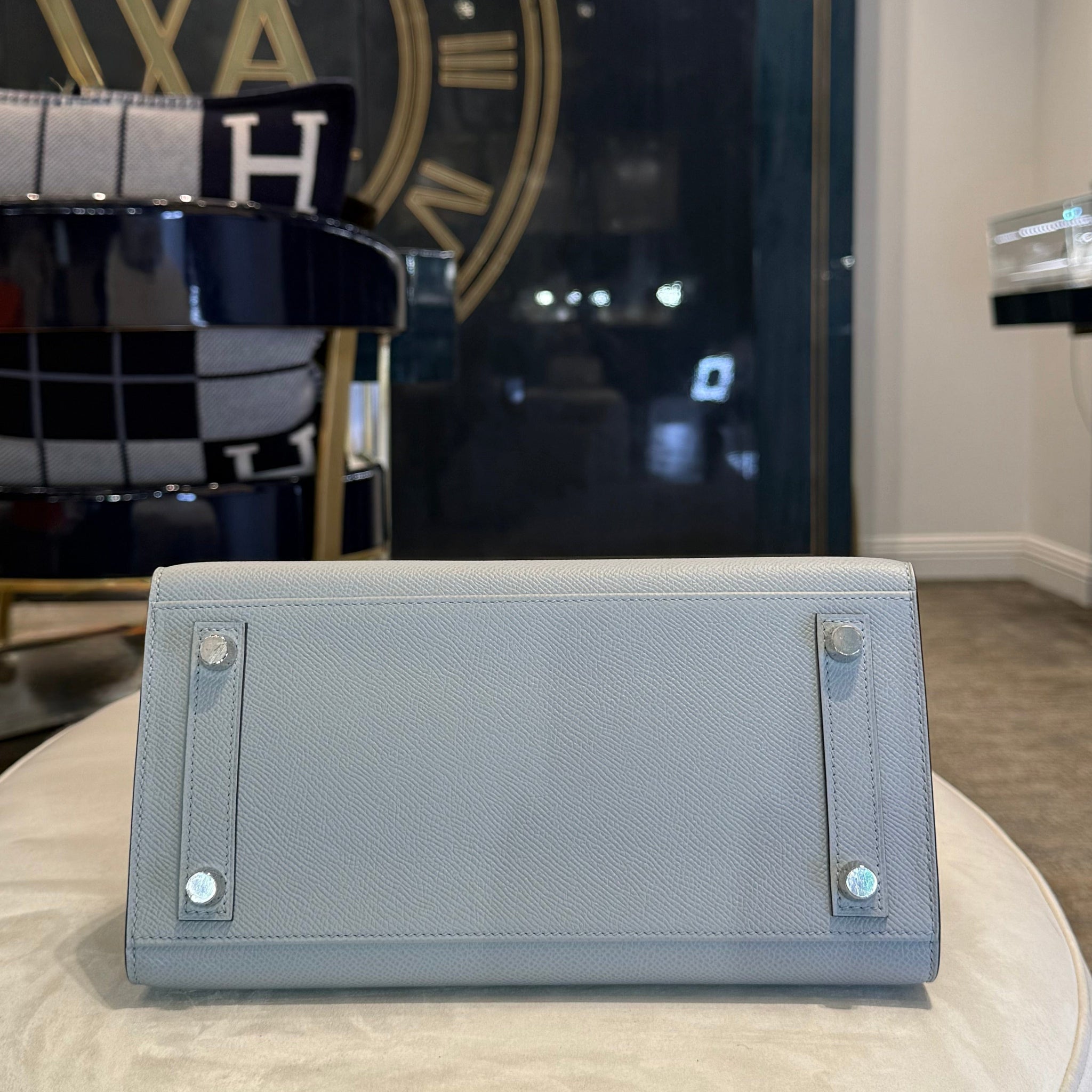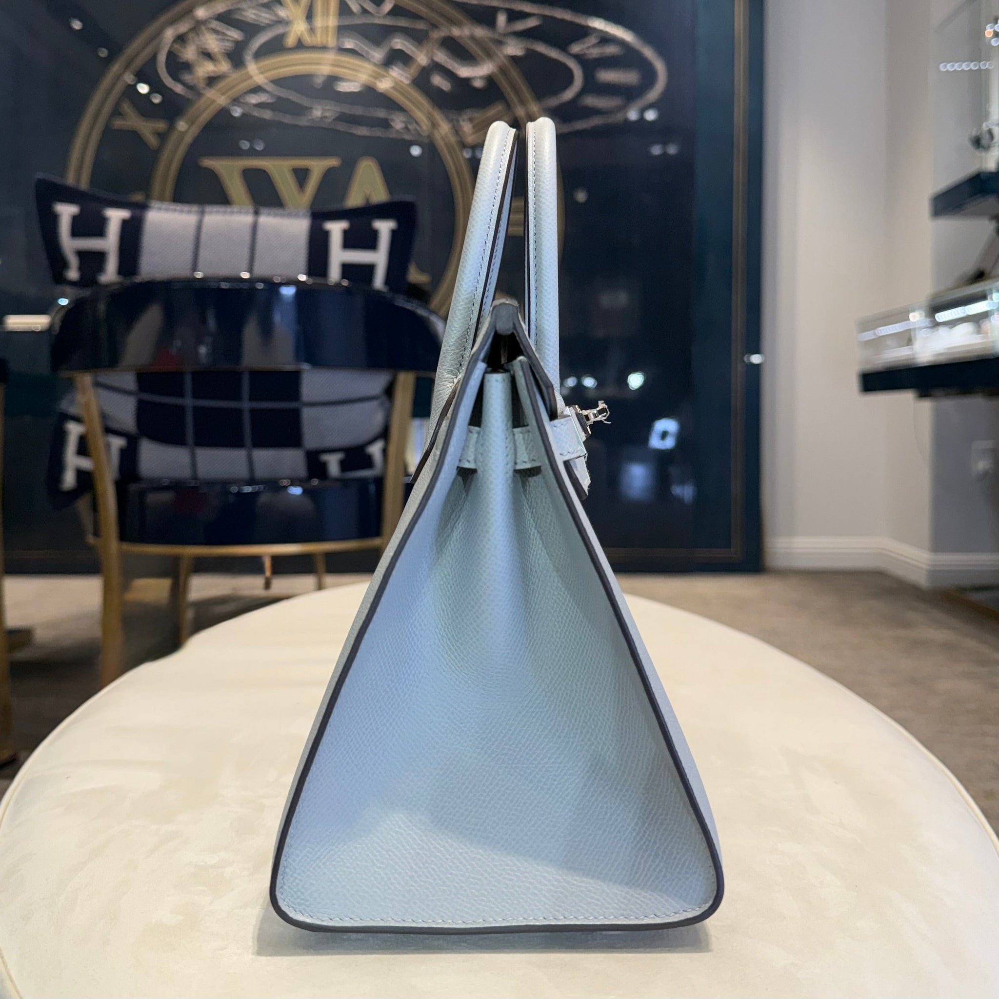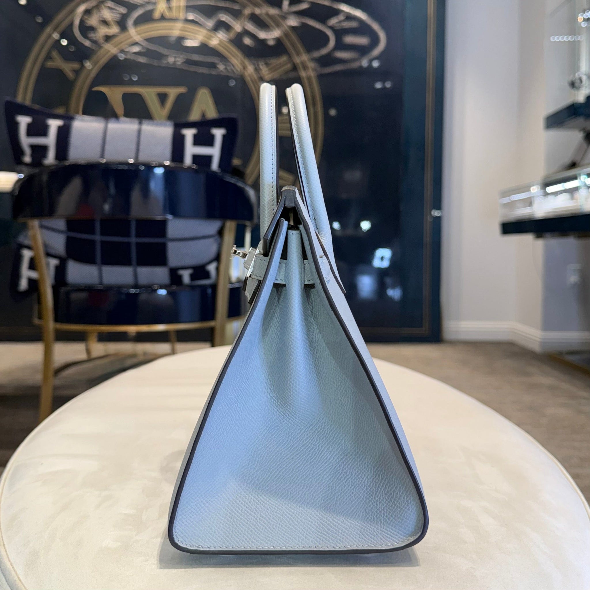 Finished with palladium hardware (PHW), this blue Birkin Sellier 25 achieves a sleek, modern balance that complements the cool tone of the leather beautifully. The structured Sellier shape lends a polished, formal aesthetic, while the 25 size remains one of the most coveted proportions—compact yet practical, ideal for both day and evening wear. The combination of Bleu Glacier and palladium hardware is particularly sought after for its understated sophistication and versatility.