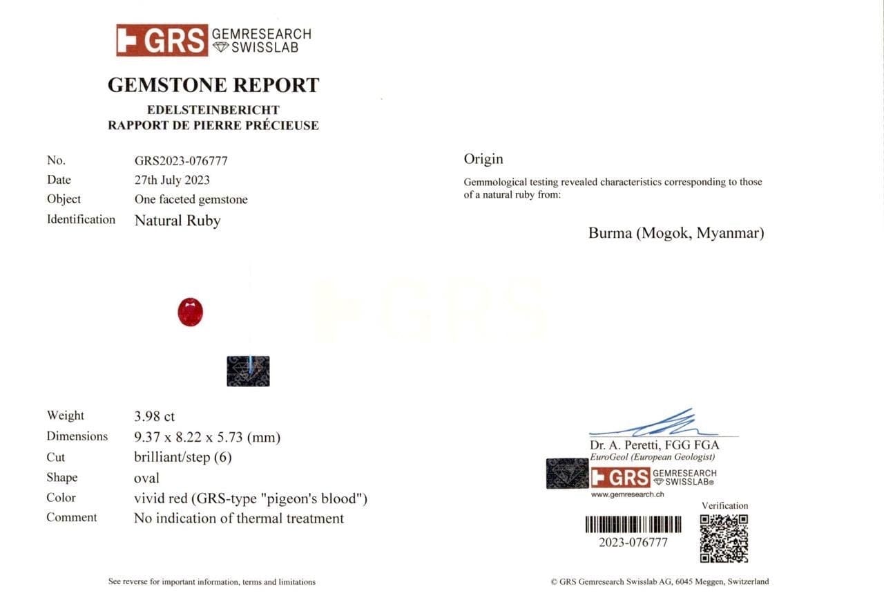 This captivating ruby ring features a glowing 3.98 carat oval Burma ruby, admired for its vivid red color and exceptional clarity. The center stone is framed by 0.78 carats of sparkling diamonds that enhance its brilliance and create a refined, harmonious silhouette. Set in a platinum band with warm gold prongs, the design blends modern sophistication with the artistry of high jewelry, making it an extraordinary choice for collectors who appreciate rare Burmese ruby rings, elevated luxury ruby jewelry, and remarkable precious gemstone pieces.