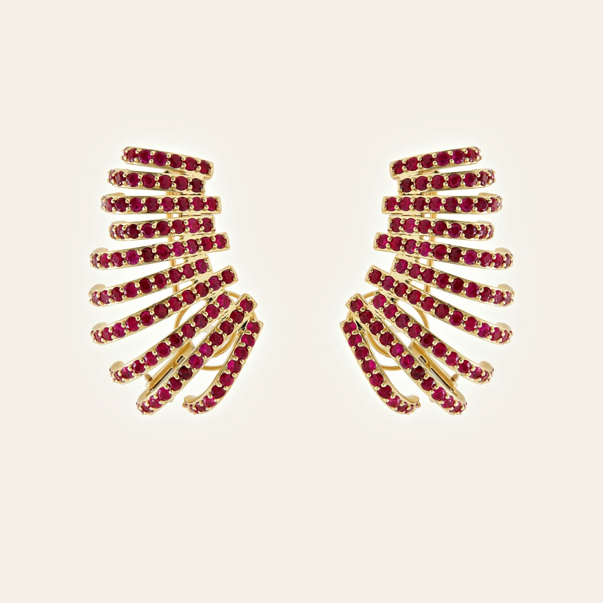 Striking and sculptural, these 18k yellow gold ruby ear cuffs bring modern glamour to any look. The curved silhouette glides along the ear with effortless beauty while vibrant round cut rubies ignite with rich color. Crafted at 15.67 grams of polished gold, this statement ruby earring is the perfect blend of bold design and class. A standout piece for evening wear or a refined fine jewelry gift, this style also offers the appeal of a modern ear cuff and ear climber, making it an essential addition for anyone who loves luxury ruby jewelry and elevated gemstone accessories.