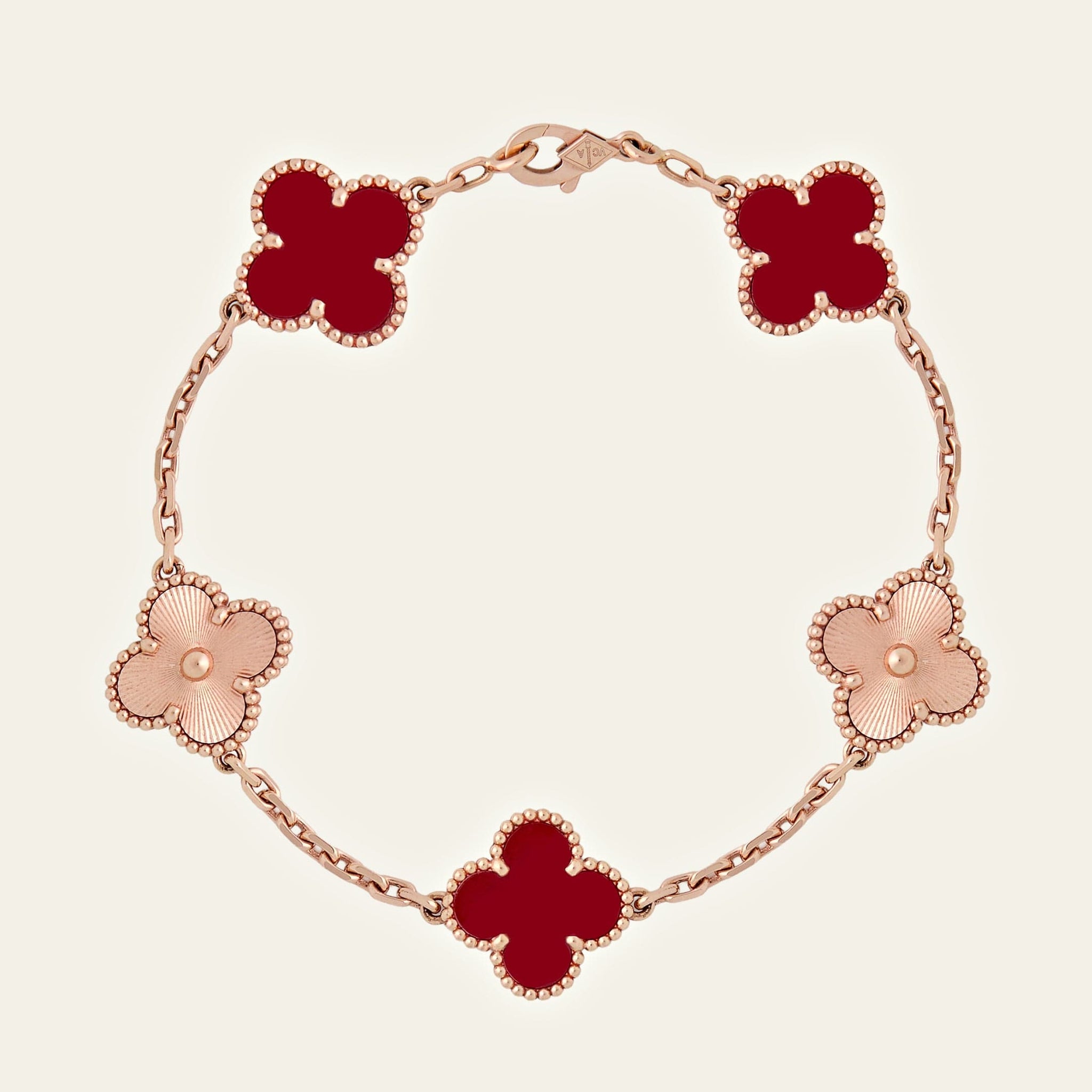 This elegant Van Cleef & Arpels Alhambra bracelet is crafted in 18K rose gold and features three vibrant carnelian motifs, complemented by two rose gold Alhambra clovers with the maison’s signature guilloché finish. The rich red hues of the carnelian stones contrast beautifully with the soft blush of rose gold, while the beaded gold edges define the iconic Alhambra silhouette. Measuring 7.48 inches and finished with a secure hallmark clasp, this carnelian Alhambra bracelet is a refined example of rose gold Alhambra jewelry and a timeless Van Cleef & Arpels bracelet.