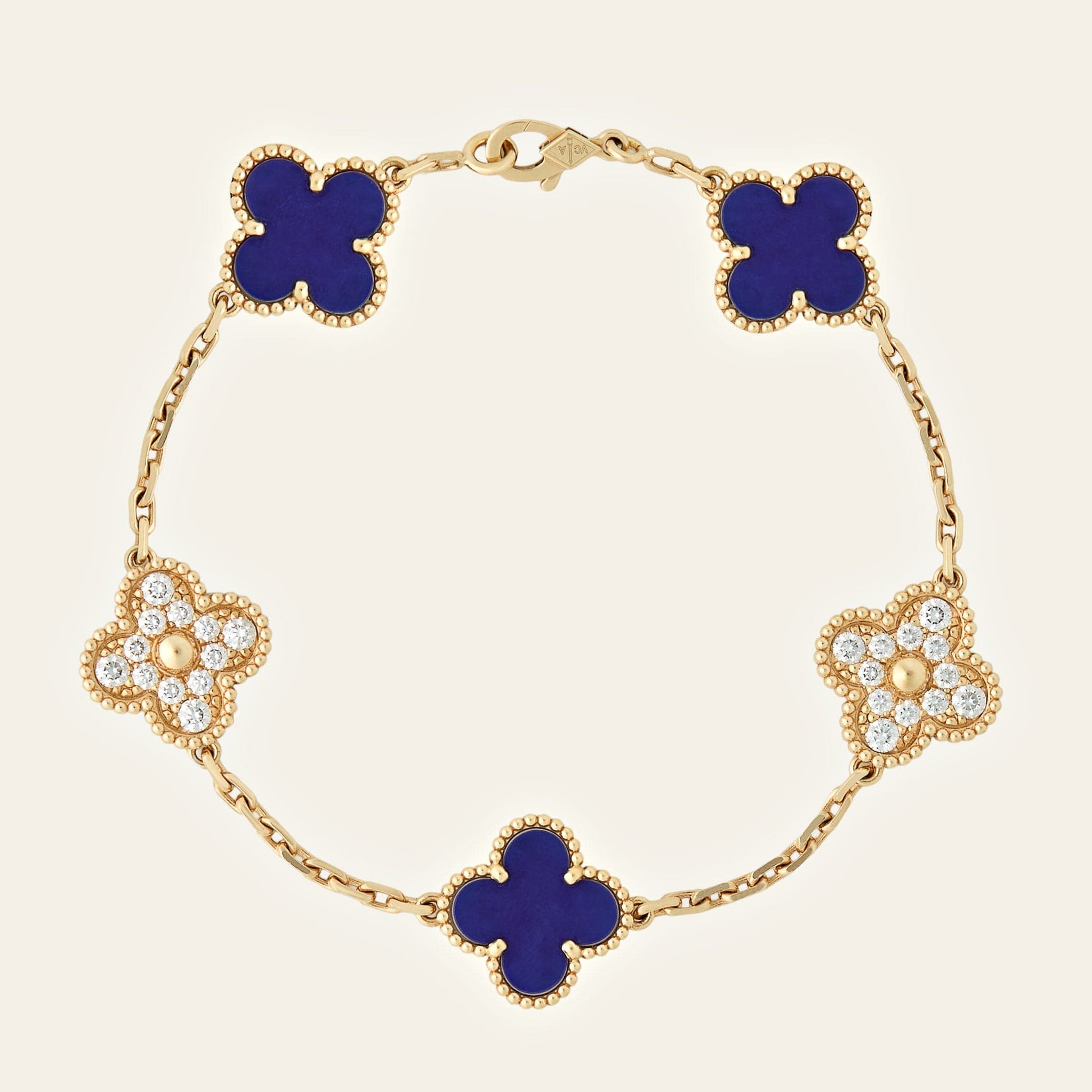 This classic Van Cleef & Arpels Alhambra bracelet is crafted in 18K yellow gold and features three deep blue lapis lazuli motifs, accented by two diamond-set clover links for a refined contrast of color and sparkle. The rich lapis stones are framed by the maison’s signature beaded gold edges, creating the iconic Alhambra silhouette. Finished with a secure hallmark clasp and measuring 7.45 inches in length, this elegant bracelet is a collectible piece designed to be worn effortlessly on its own or layered with fine gold jewelry.