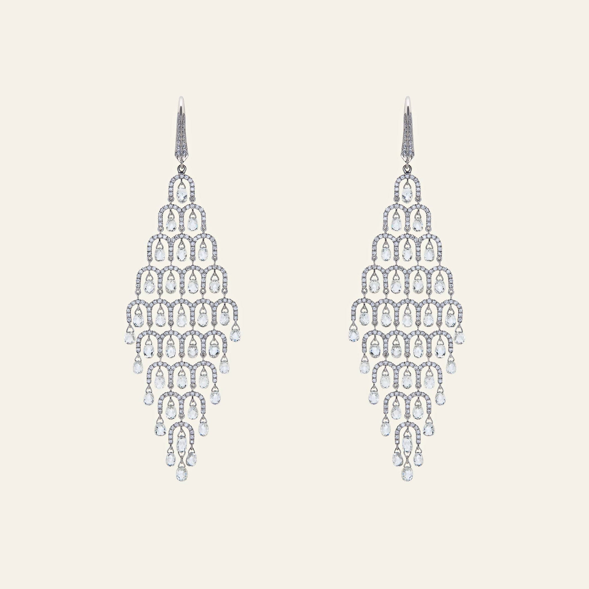 The Rose Cut Diamond Chandelier Earrings are a refined statement of movement and light, designed with a graceful cascading silhouette that feels both airy and elegant. These diamond chandelier earrings feature delicately suspended briolette diamonds that shimmer with every turn, highlighted by 70 briolette's totaling 12.49 carats and 482 side diamonds adding 2.14 carats of brilliance. Two luminous rose cut diamonds totaling 0.47 carats create a soft focal point, making these rose cut diamond earrings an exquisite choice for black-tie events, weddings, or elevated evening wear.