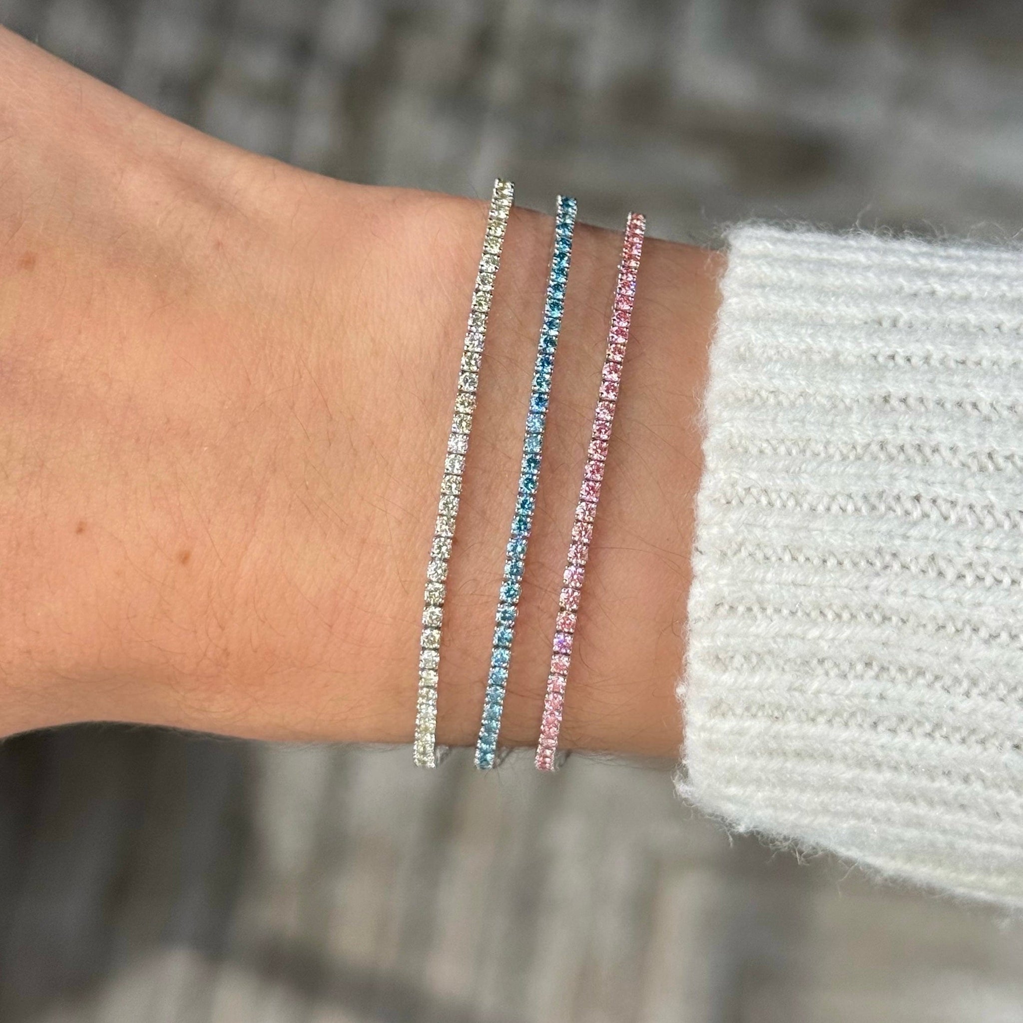 Infused with captivating color, this 14K white gold tennis bracelet glows with 95 round fancy vivid pink diamonds, totaling 1.51 carats. Each VS2 clarity diamond is prong-set to maximize its intense, fiery hue, making this piece a rare statement of elegance. Designed for those who appreciate bold luxury, it’s a radiant celebration of pink brilliance.