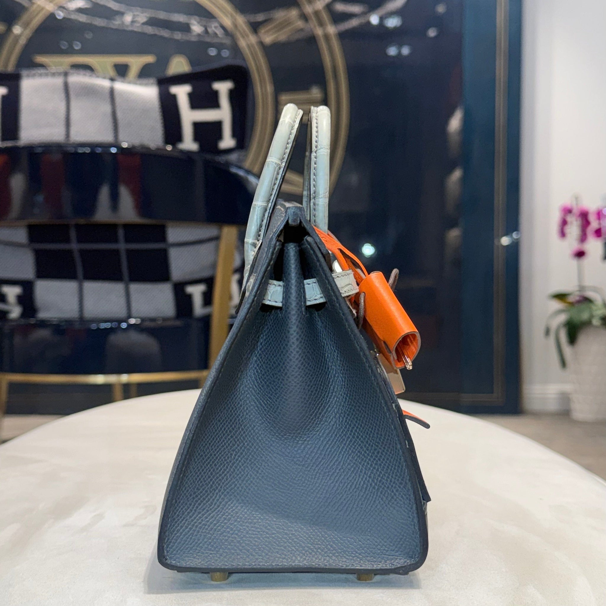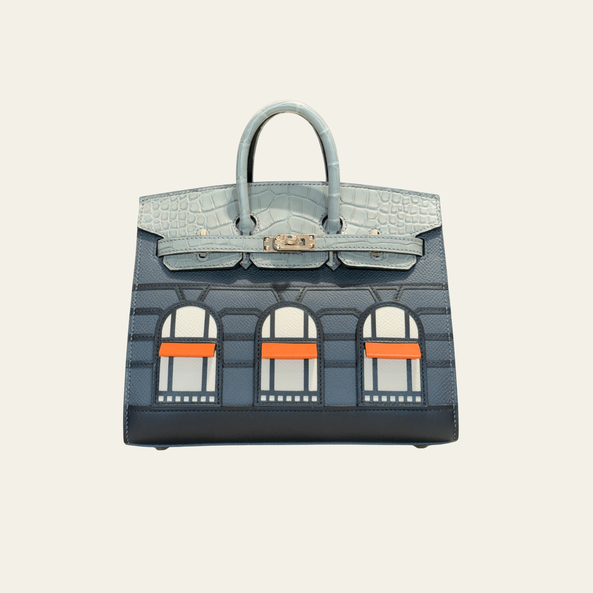 Finished with Permabrass hardware, this Faubourg Birkin 20 showcases Hermès’ newest champagne-gold metal tone—lighter and softer than traditional gold hardware—perfectly complementing the muted greys and architectural detailing. The Sellier construction sharpens every line of the façade, while the mixed-material execution demonstrates the extraordinary technical precision required to construct such a complex design. Produced in extremely limited quantities and never available through standard retail channels, the “Rainy Days” Faubourg Birkin is considered one of the most coveted modern Faubourg editions.