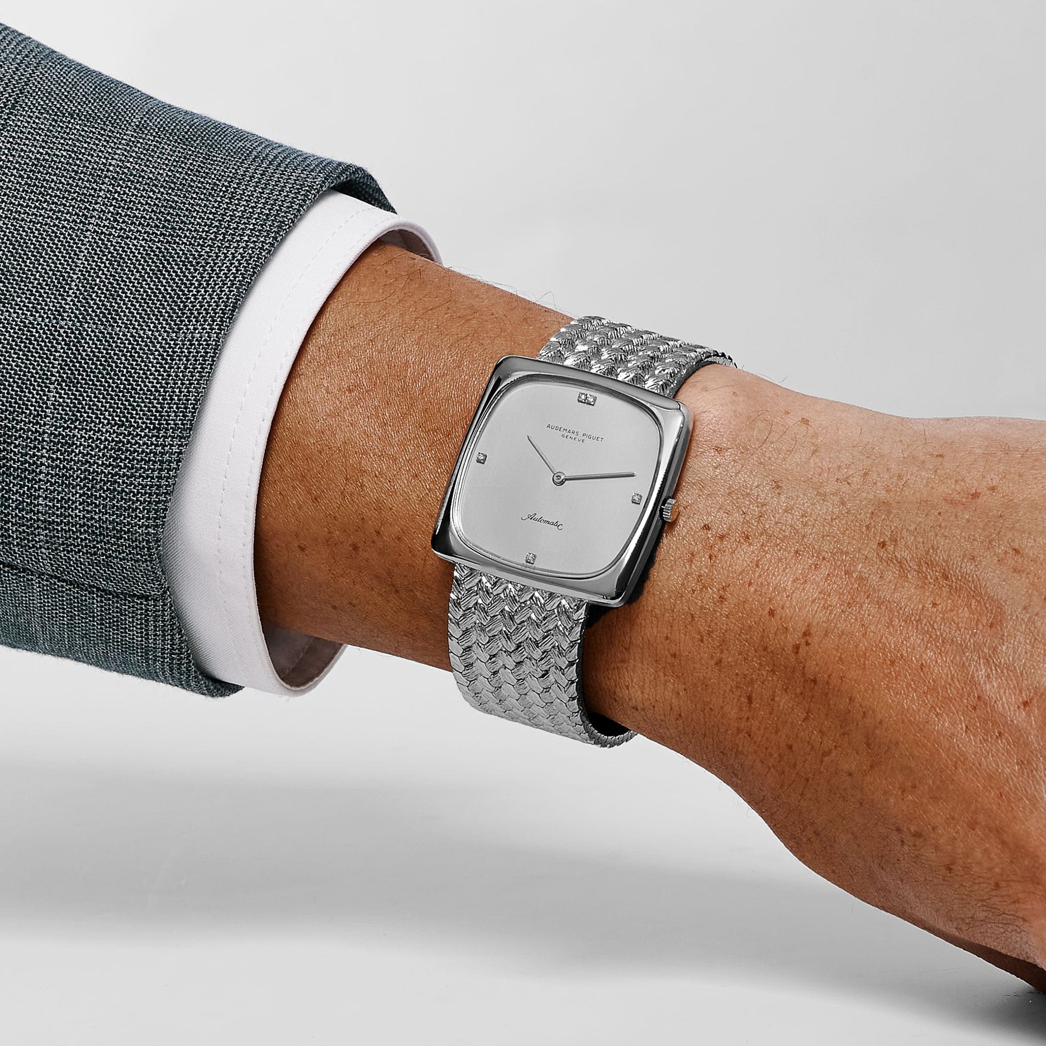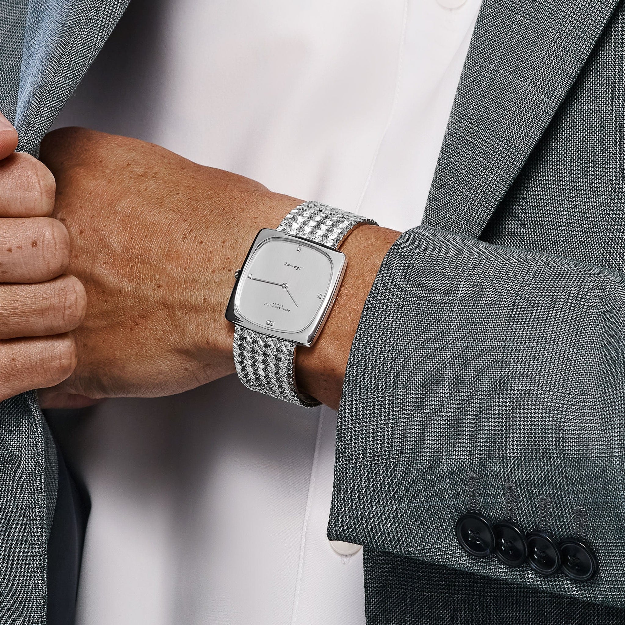 This vintage Audemars Piguet Jumbo Square presents a rare interpretation of the brand’s mid-20th century design language, merging minimalist form with jeweled elegance. Crafted in solid 18k white gold, the 34 mm square case is paired with a woven white-gold bracelet that flows seamlessly into the case, giving the piece a refined jewelry-like presence. Its silver dial features a diamond-set configuration—two brilliant stones at 12 o’clock, with single markers at 3, 6, and 9—offering discreet sparkle against the understated background.
