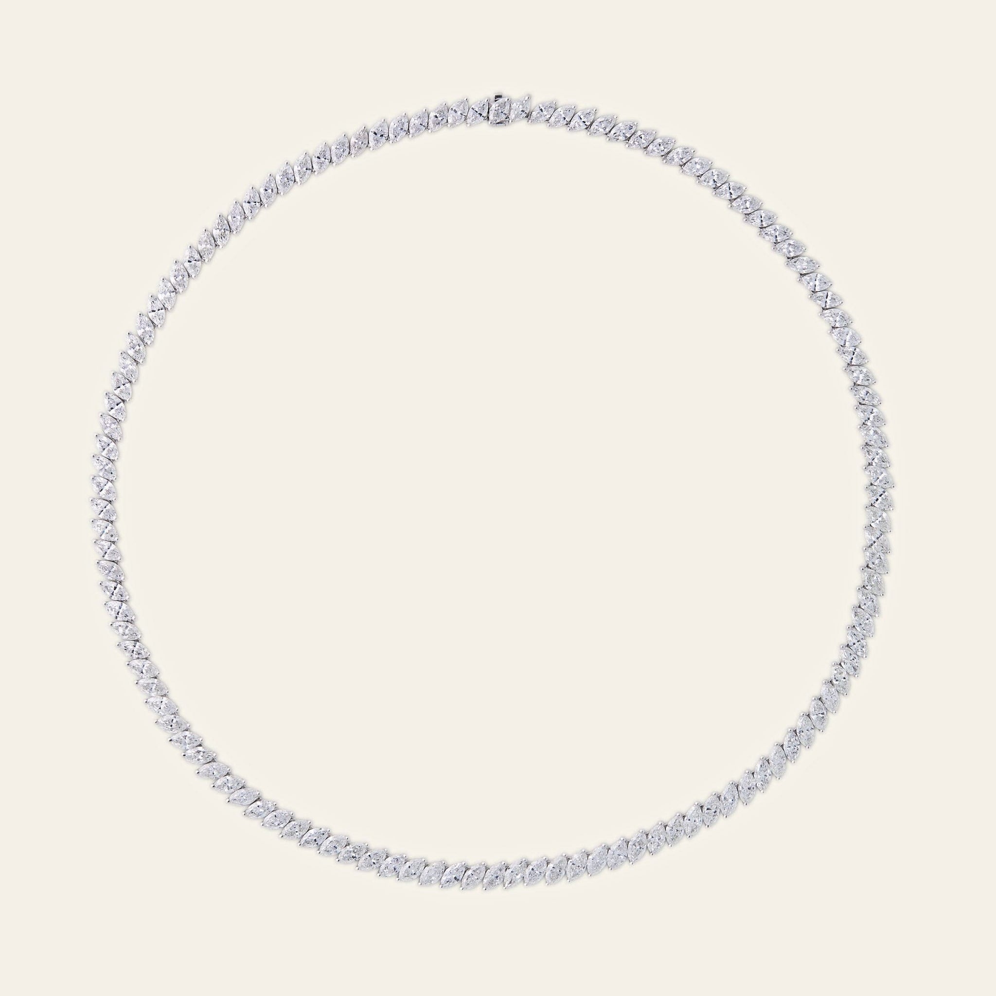 The Eloise Marquise Diamond Tennis Necklace is a striking expression of high-jewelry elegance. A seamless line of marquise-cut diamonds drapes fluidly along the neckline, creating a continuous ribbon of light. Set with 114 perfectly matched marquise diamonds totaling 24.06 carats in bright G color and VS clarity, it reflects light with exceptional intensity. Each stone is arranged to emphasize the marquise’s elongated shape, giving the necklace a graceful, shimmering movement and showcasing superb craftsmanship.