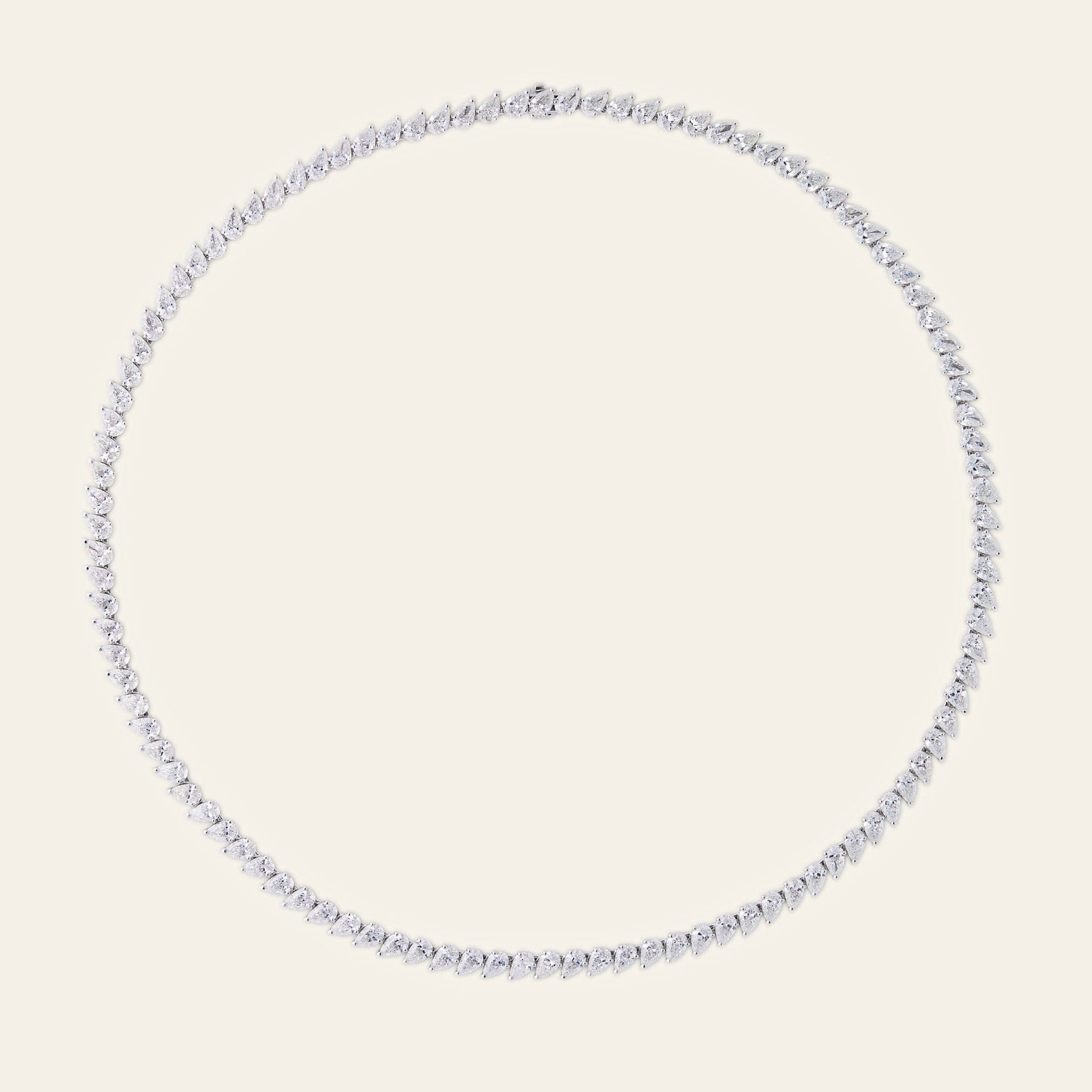 Crafted in 18k white gold, our Esme pear diamond tennis necklace brings a modern edge to classic high jewelry. A full line of 106 hand-matched pear-shaped diamonds creates a seamless, sculptural flow of brilliance along the neckline. At 16.5 inches, it drapes with effortless elegance, striking enough for evening, yet refined for everyday luxury.