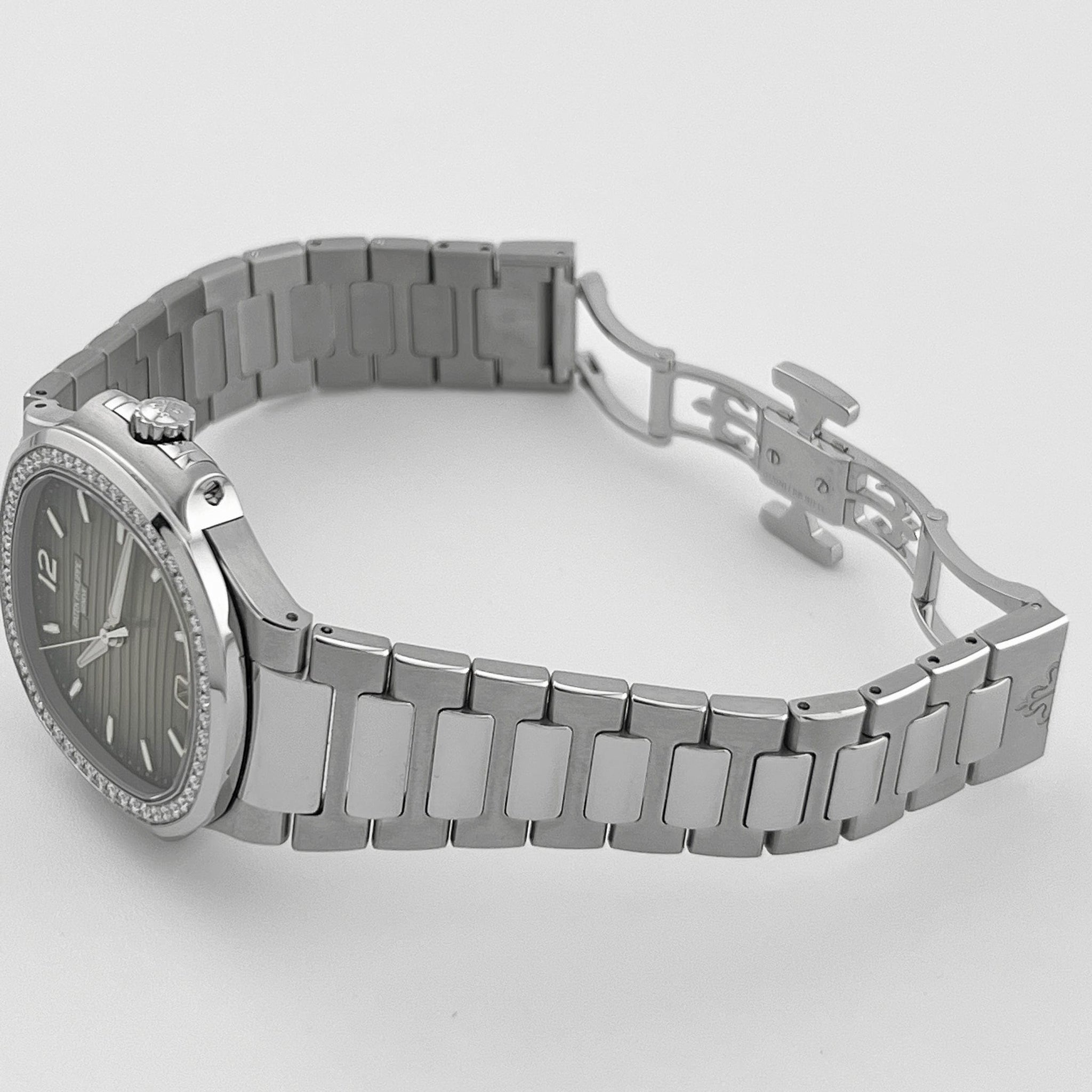 The Patek Philippe Ladies Nautilus 7118/1200A-011 blends sport and elegance in one of the most versatile women's luxury watches on the market. Crafted in stainless steel, the 35.2mm case is paired with a smoked grey dial. The dial features a wave-like embossed texture, gold-applied numerals with luminescent coating, and a date window at 6 o’clock, all protected under a sapphire crystal. Framed by a factory-set diamond bezel of 56 brilliant-cut stones, this reference brings refined sparkle to the everyday Nautilus design.