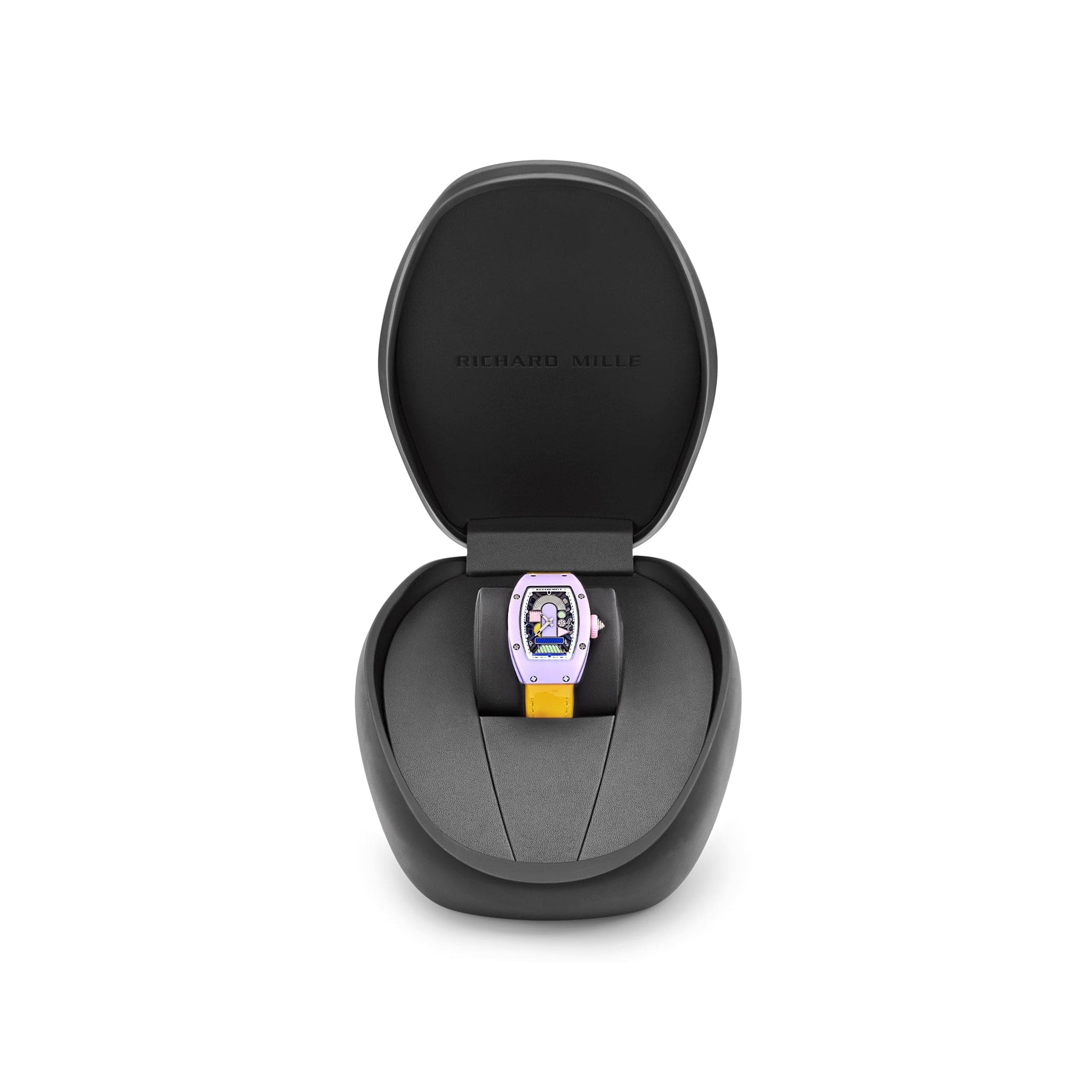 Inside, the RM 07-01 is powered by the CRMA2 automatic movement, developed in-house with a skeletonized titanium baseplate, variable-geometry rotor, and refined finishing throughout. The dial is an intricate mosaic of colored ceramic inserts arranged in a stylized Art Deco motif, accented by gold framing and set beneath a curved sapphire crystal. Designed to combine haute horlogerie with joyful visual expression, the RM 07-01 Lavender Pink Ceramic is a bold and feminine statement piece—fusing technical precision with contemporary art and design in true Richard Mille fashion.
