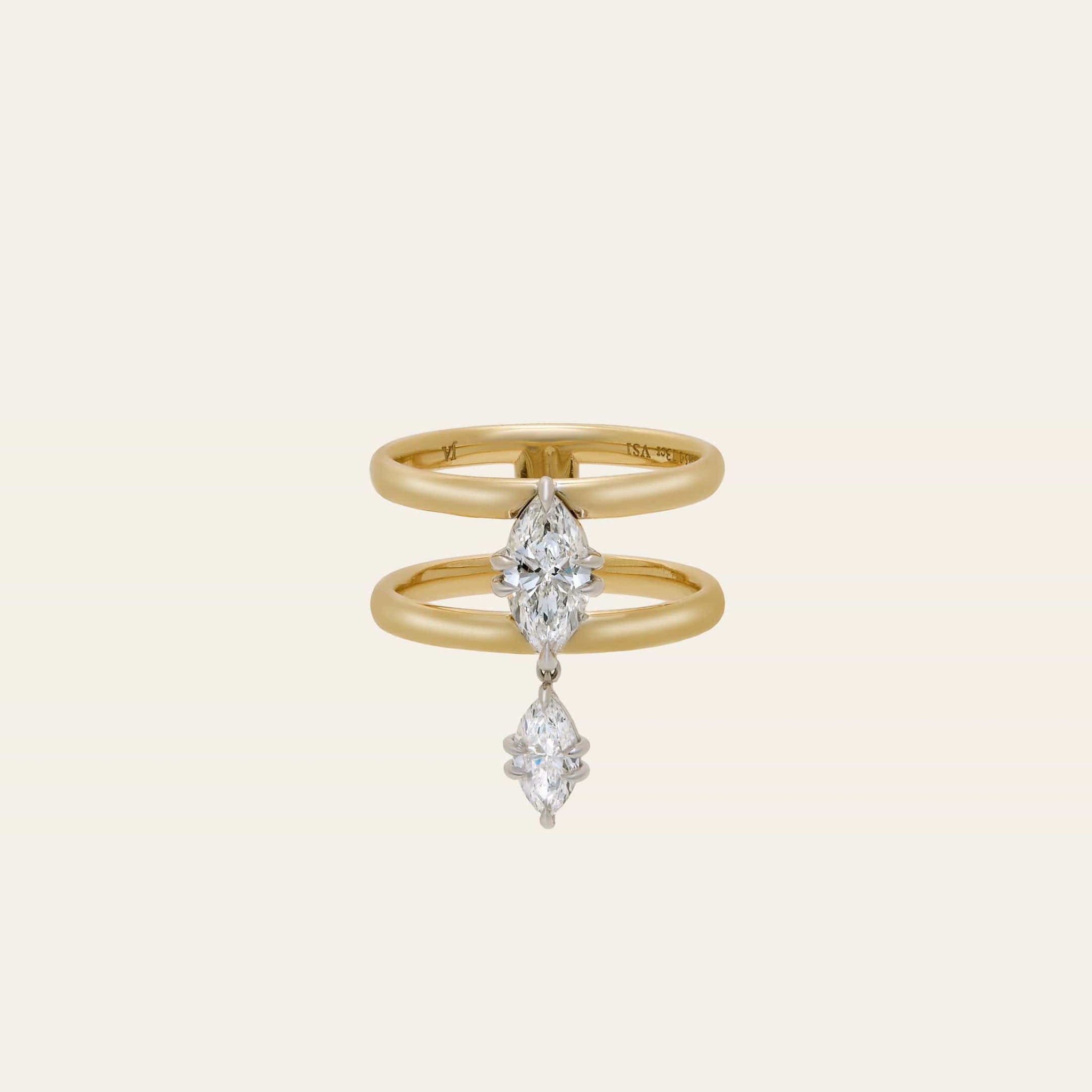 Designed to mirror the radiance of starlight, the Celestia Double Band Marquise Drop Ring embodies the movement and brilliance of constellations in a contemporary form. Handcrafted in gold, the ring features two parallel bands joined by an approximately 0.70 carat marquise diamond at the center, while an approximately 0.43 carat marquise diamond delicately suspends below, creating a captivating play of light with every motion.
