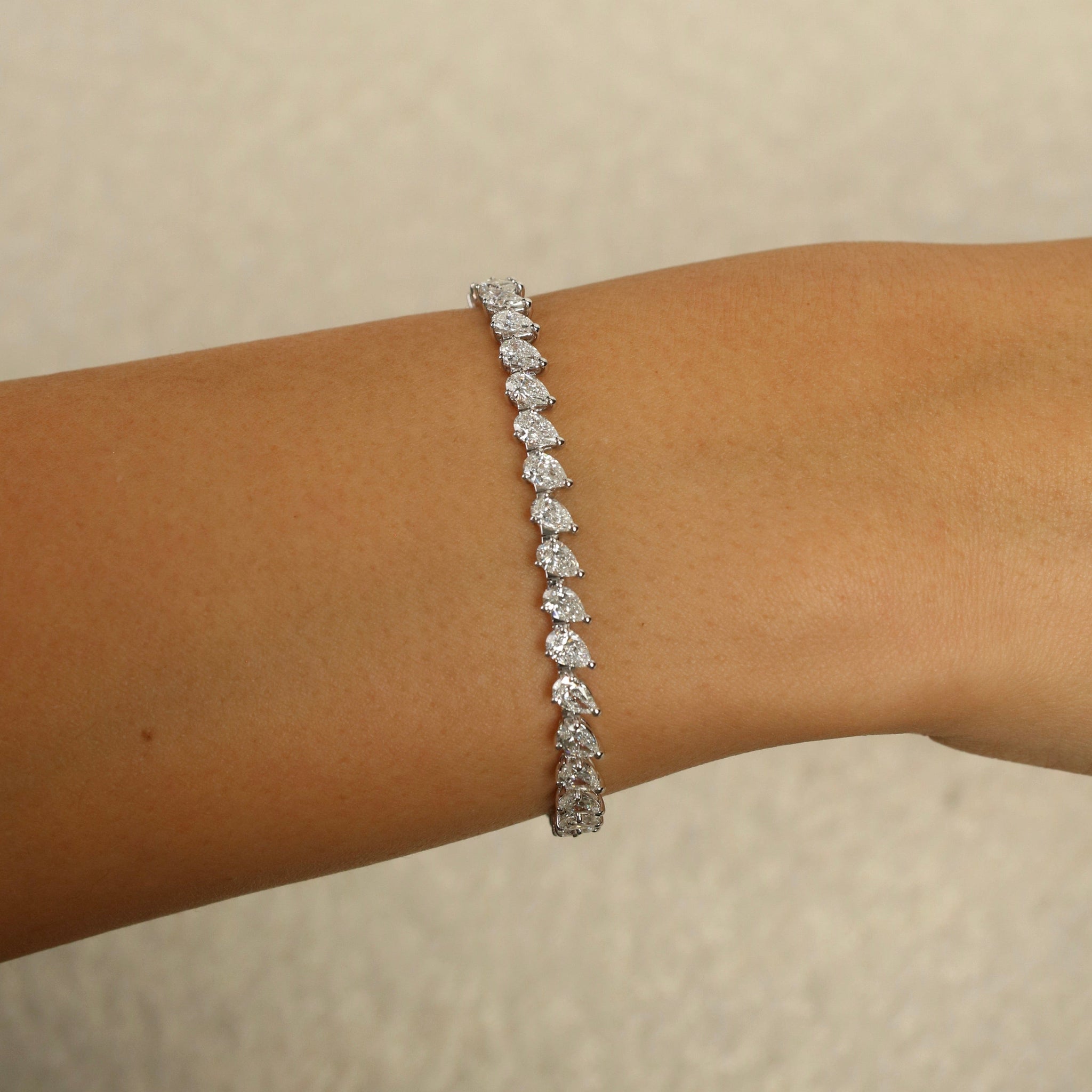 The Esme Pear Diamond Tennis Bracelet brings a soft, elongated elegance to the wrist. Each of its 38 pear-cut diamonds—totaling 7.10 carats in bright G color and VS clarity—is meticulously chosen for symmetry and fire, creating a seamless line of brilliance. The distinctive teardrop silhouette adds a romantic, sculptural touch, giving this bracelet a luxurious presence from every angle.