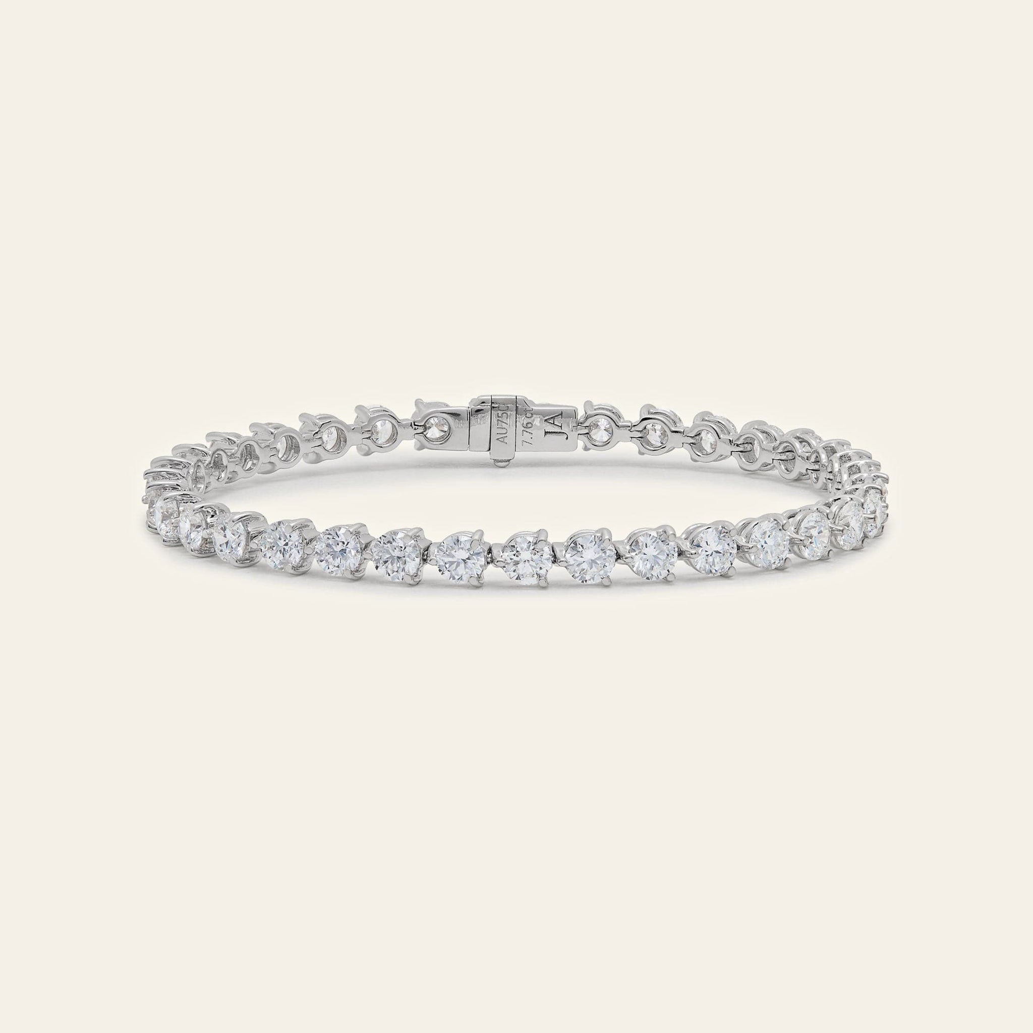 The Luce three-prong diamond tennis bracelet adds a modern, elegant twist to any jewelry stack. Each round brilliant diamond is set in an open three-prong design that maximizes radiance, creating a bright, lively sparkle with every movement. With 35 G-color, VS-clarity diamonds totaling 7.76 carats, it delivers clean brilliance and a polished fine-jewelry finish. Its refined structure makes this round diamond tennis bracelet both versatile and luxurious.
