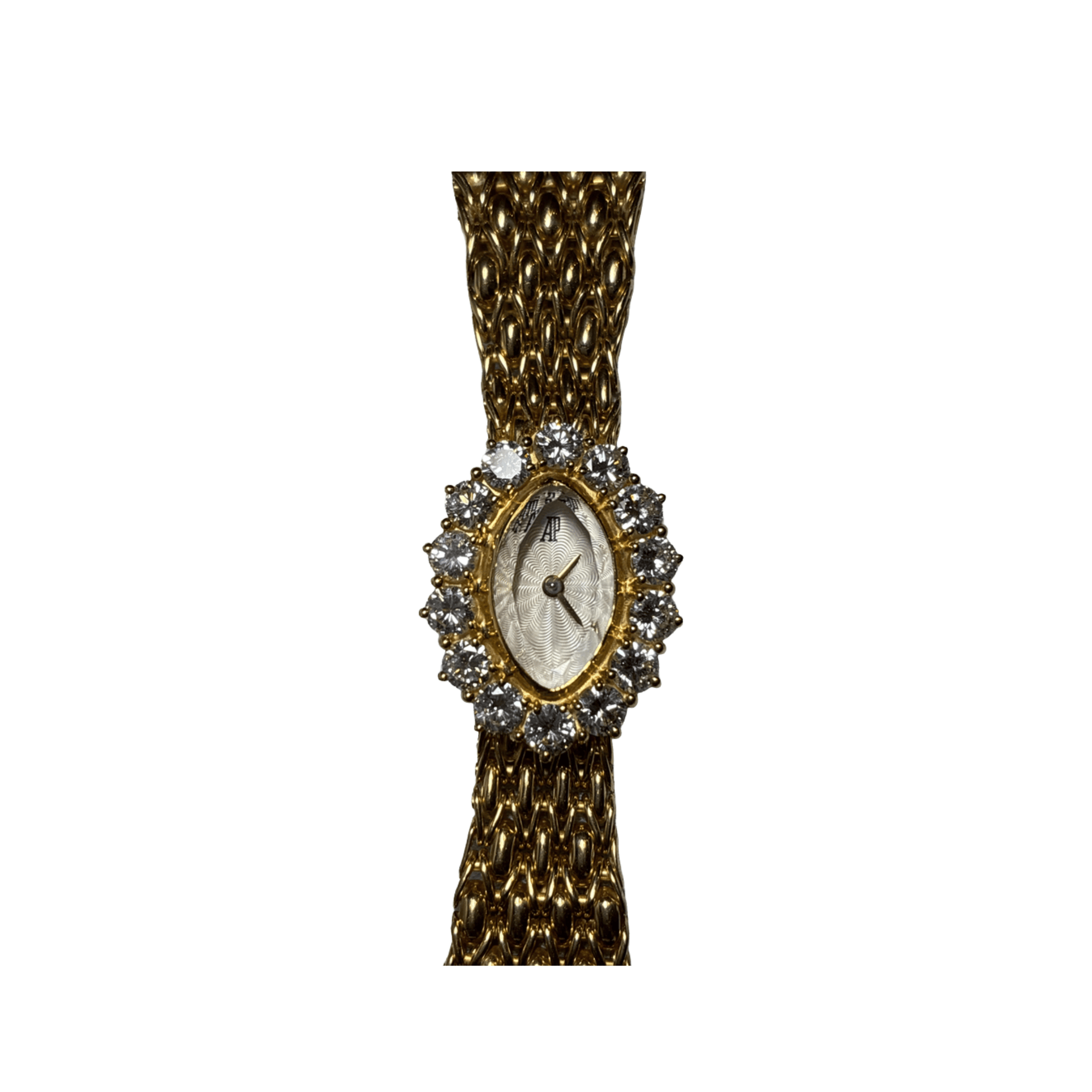 This vintage Audemars Piguet oval cocktail watch reflects a period when the brand applied its finishing standards to fine jewelry watches, not just sport icons. Crafted in yellow gold, the elongated oval case is framed by a diamond-set bezel that emphasizes elegance over scale, while the integrated gold bracelet gives the piece the presence of a jewel rather than a traditional wristwatch. These designs were produced in limited quantities and often retailed through select boutiques, making surviving examples increasingly hard to find in strong condition.