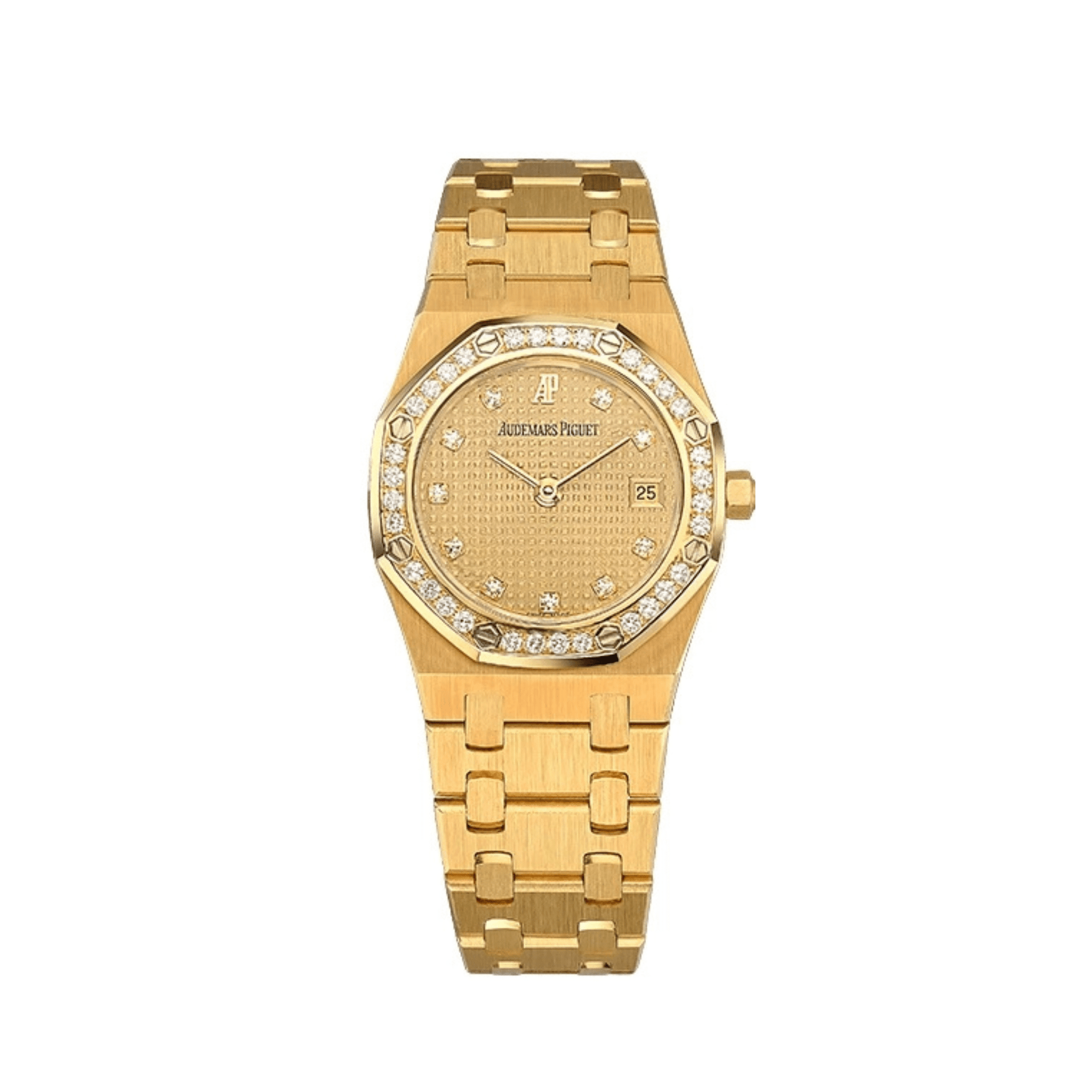 The vintage Audemars Piguet Royal Oak 66319.BA.Z.0722.BA.03 is a sophisticated statement in refined luxury. With a full 18 k yellow gold case and integrated bracelet, it maintains the iconic octagonal bezel and screw-head motif of the Royal Oak line while elevating it through full precious-metal execution. The warm champagne-toned dial provides generous contrast to the polished gold hands, while the factory-set diamond bezel and diamond markers adds a discreet sparkle befitting formal wear. Powered by a precise quartz movement, it combines effortless reliability with high-jewellery craftsmanship.