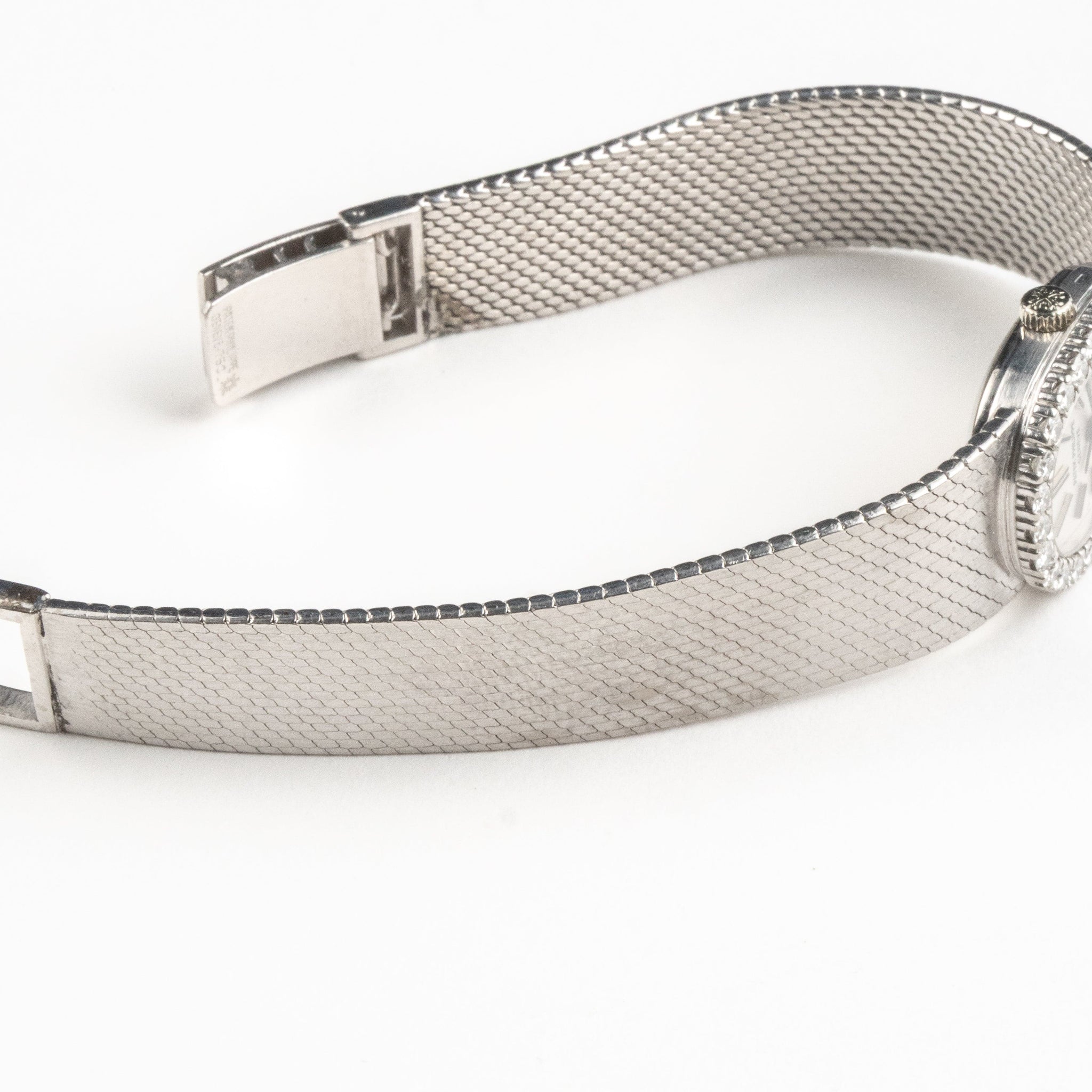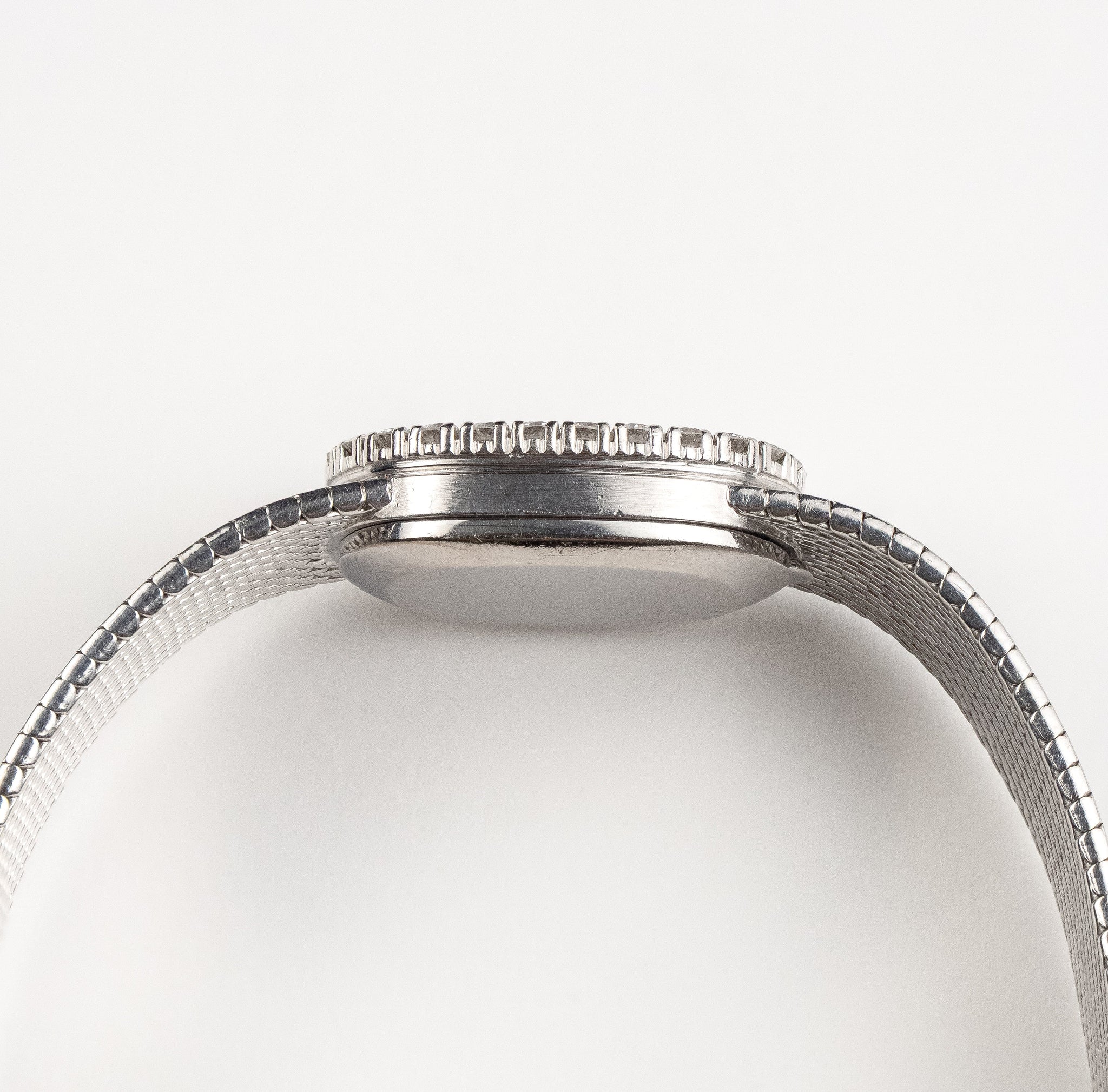 This reference pairs a white gold case with a full diamond bezel that frames the silver dial without overwhelming it. Applied hour markers and slim hands maintain clean legibility, while the integrated bracelet—or matching white gold strap option—offers seamless wrist appeal. The Ellipse 3377 blends minimalist form with premium finishing and gem-setting, delivering a discreet yet distinctive piece for connoisseurs of refined style.