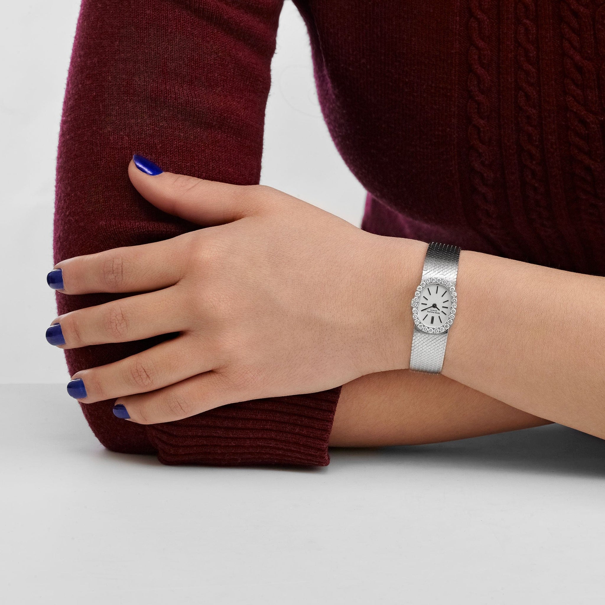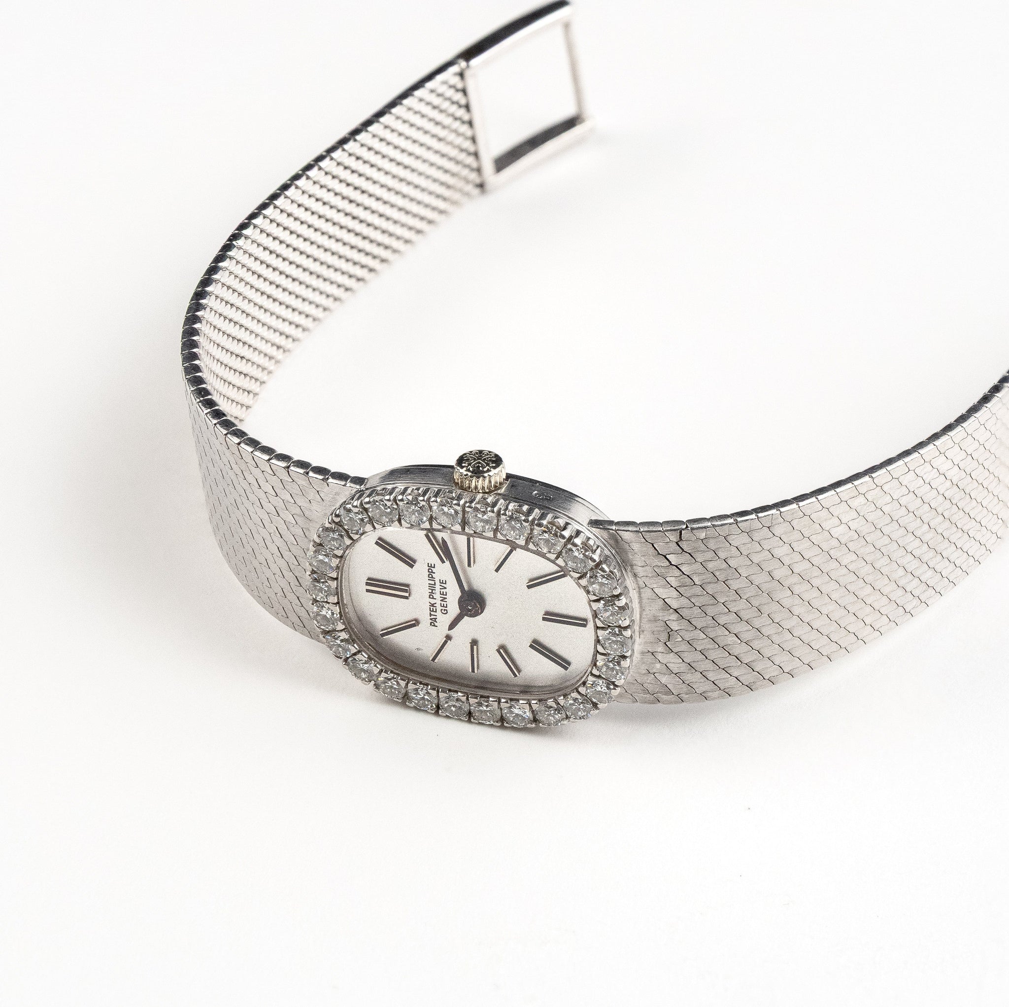 The Patek Philippe Ellipse 3377 in white gold with a silver dial and diamond-set bezel reaffirms the model’s unique geometric identity, rooted in the “golden ratio” case shape introduced decades ago. With a 17.4mm width, this compact size emphasizes elegance and femininity, making it an appealing option for collectors seeking understated luxury with architectural design intent.