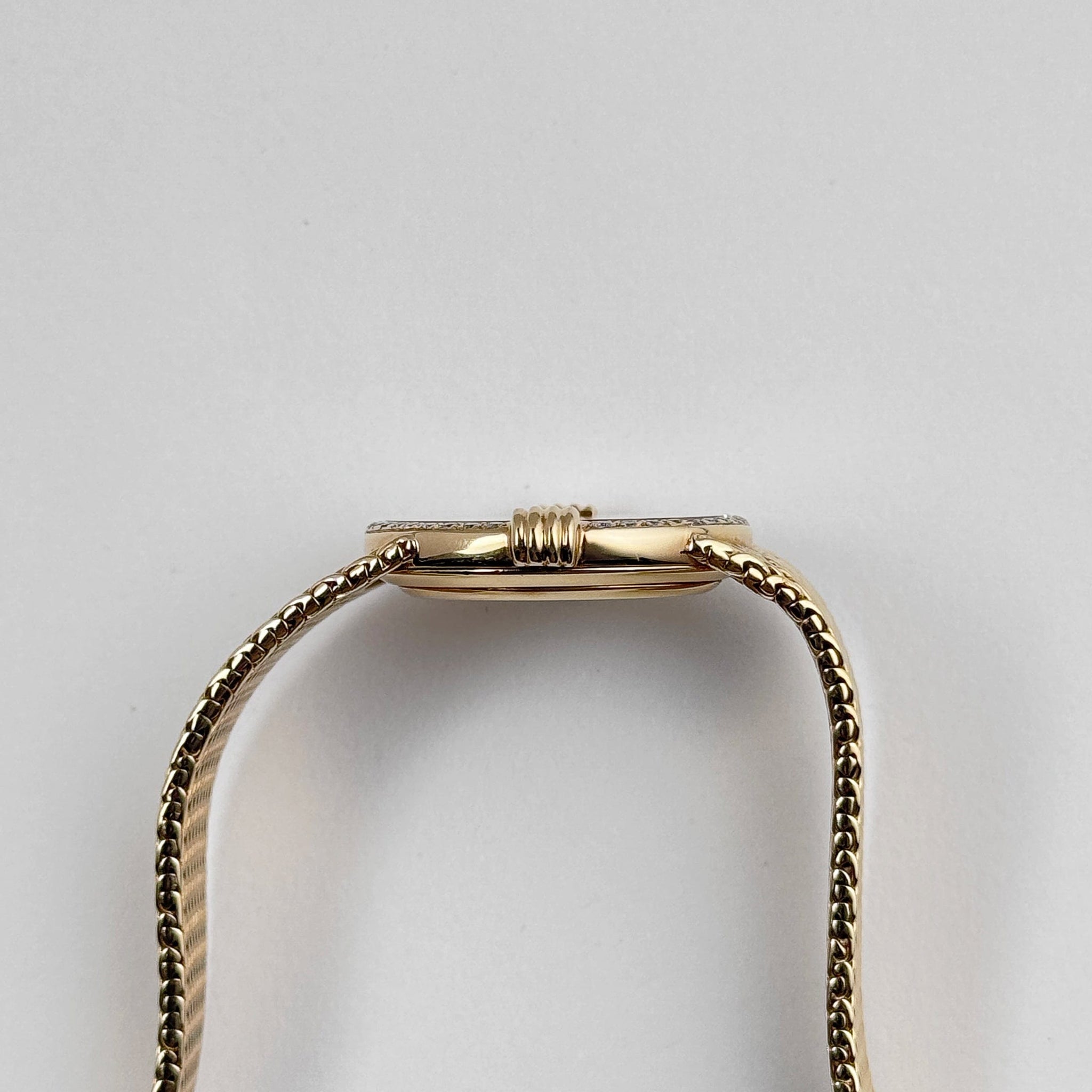 A striking vintage timepiece, the Patek Philippe Ellipse in yellow gold combines timeless design with understated opulence. The iconic elliptical case, a hallmark of Patek Philippe’s craftsmanship, is elegantly proportioned, exuding sophistication in its slim profile. Framing the watch is a meticulously set diamond bezel, adding a refined brilliance to the piece.
