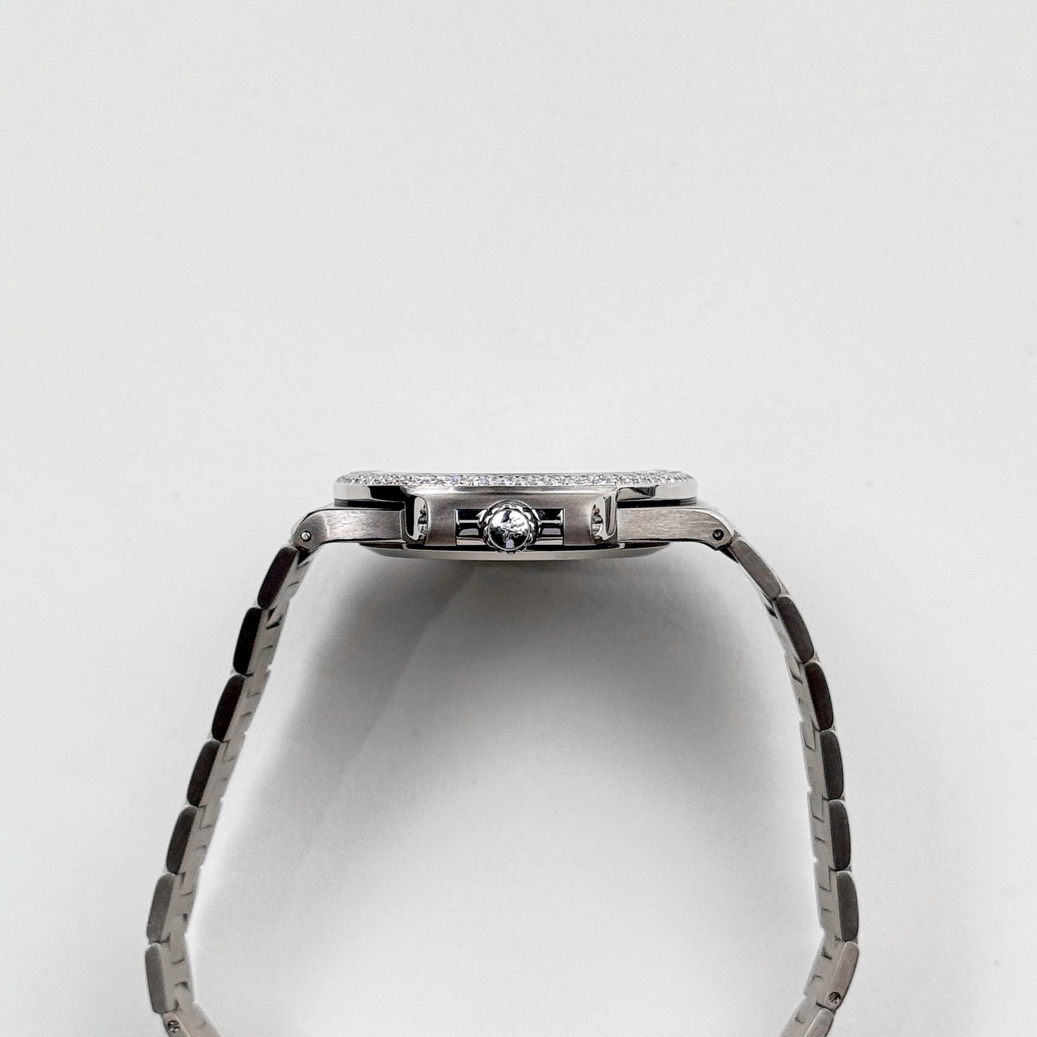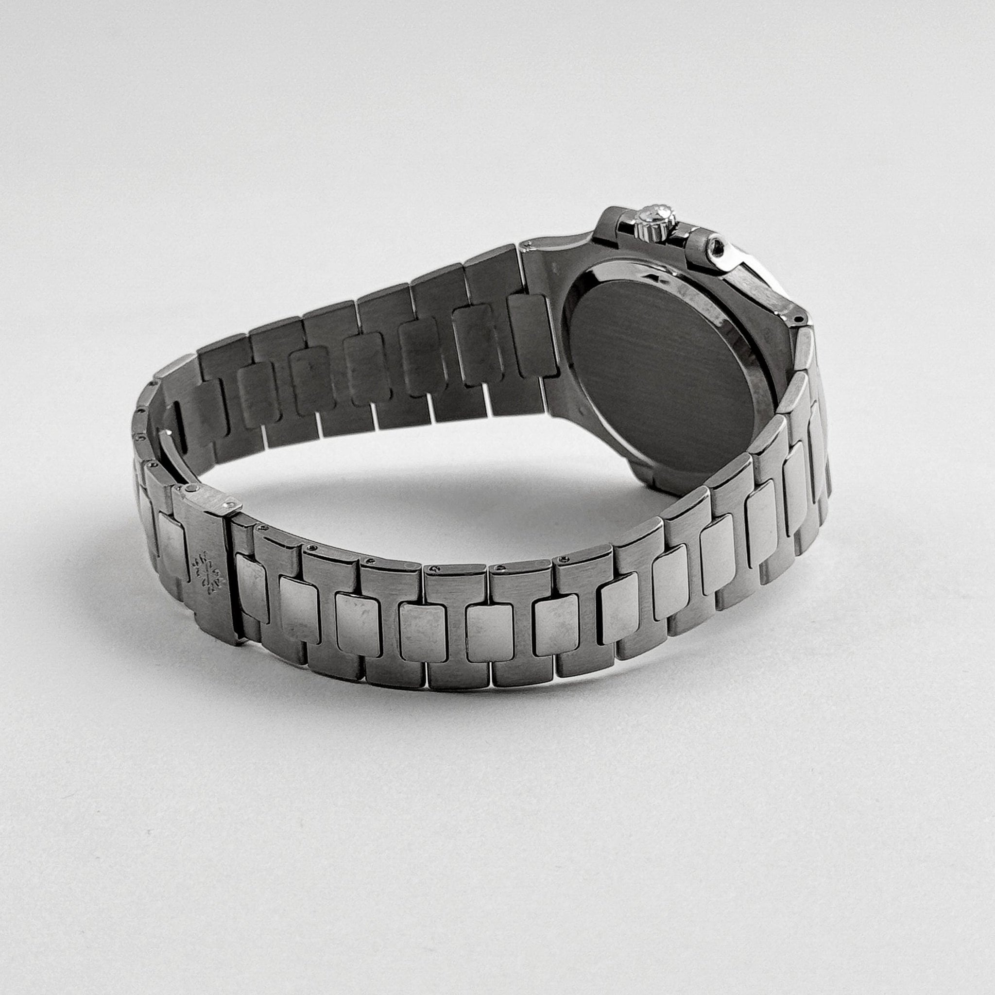 The Patek Philippe Nautilus 3800/4G-001 is an elegant interpretation of the iconic Nautilus design, presented in a white gold case with a diamond-set bezel. Its 37.5mm size retains the signature rounded octagonal bezel and integrated bracelet that define the Nautilus collection. Crafted in 18k white gold, the watch exudes understated luxury, while the factory diamond bezel adds a subtle brilliance that enhances the timepiece’s sophisticated appeal.