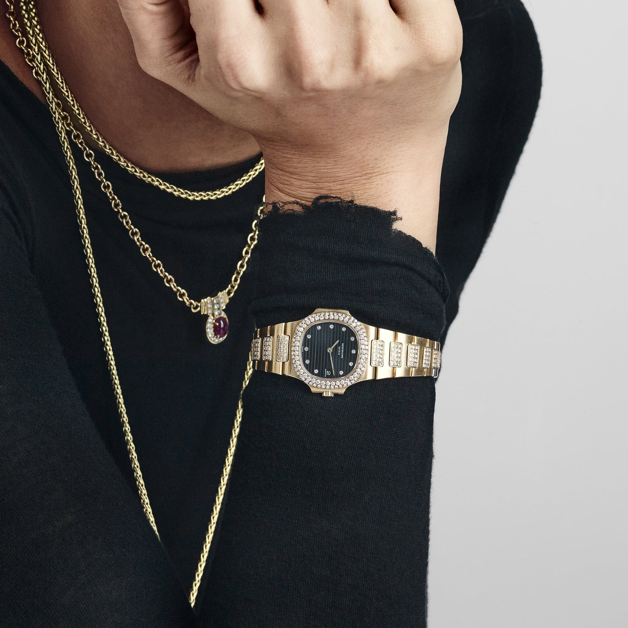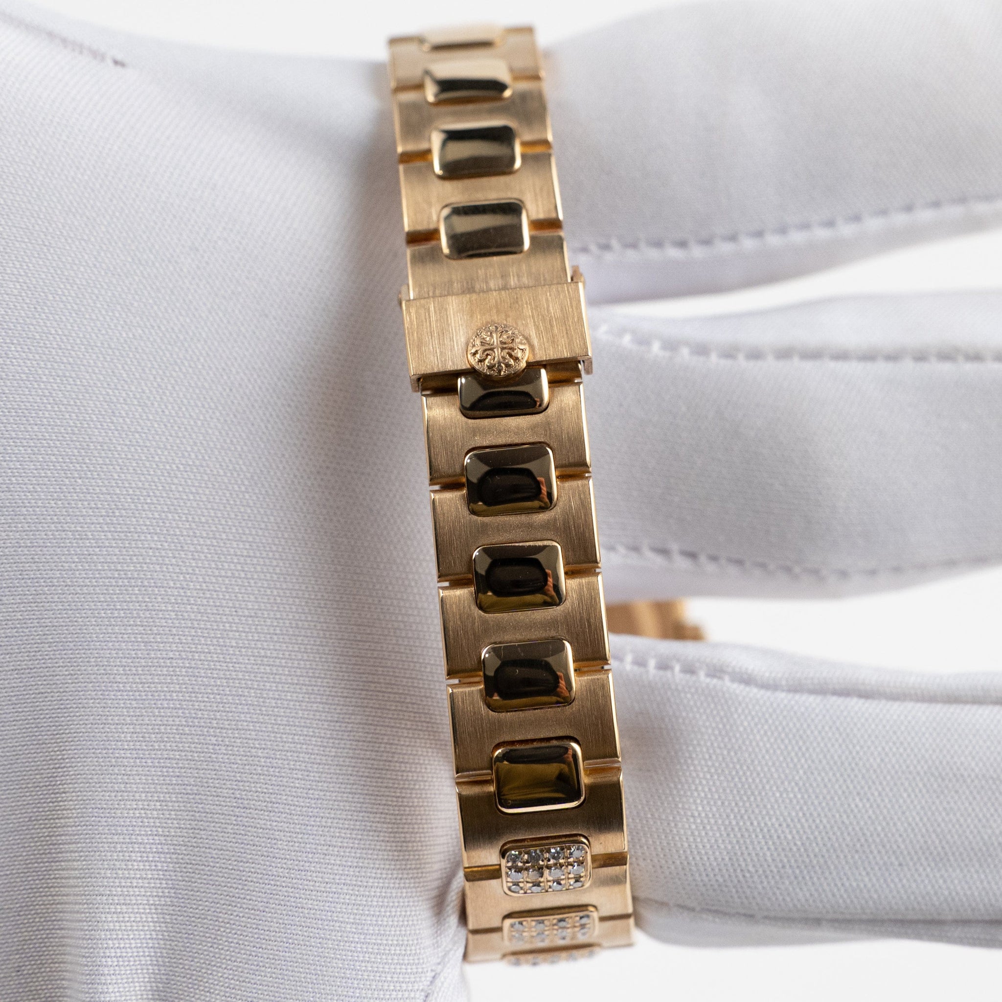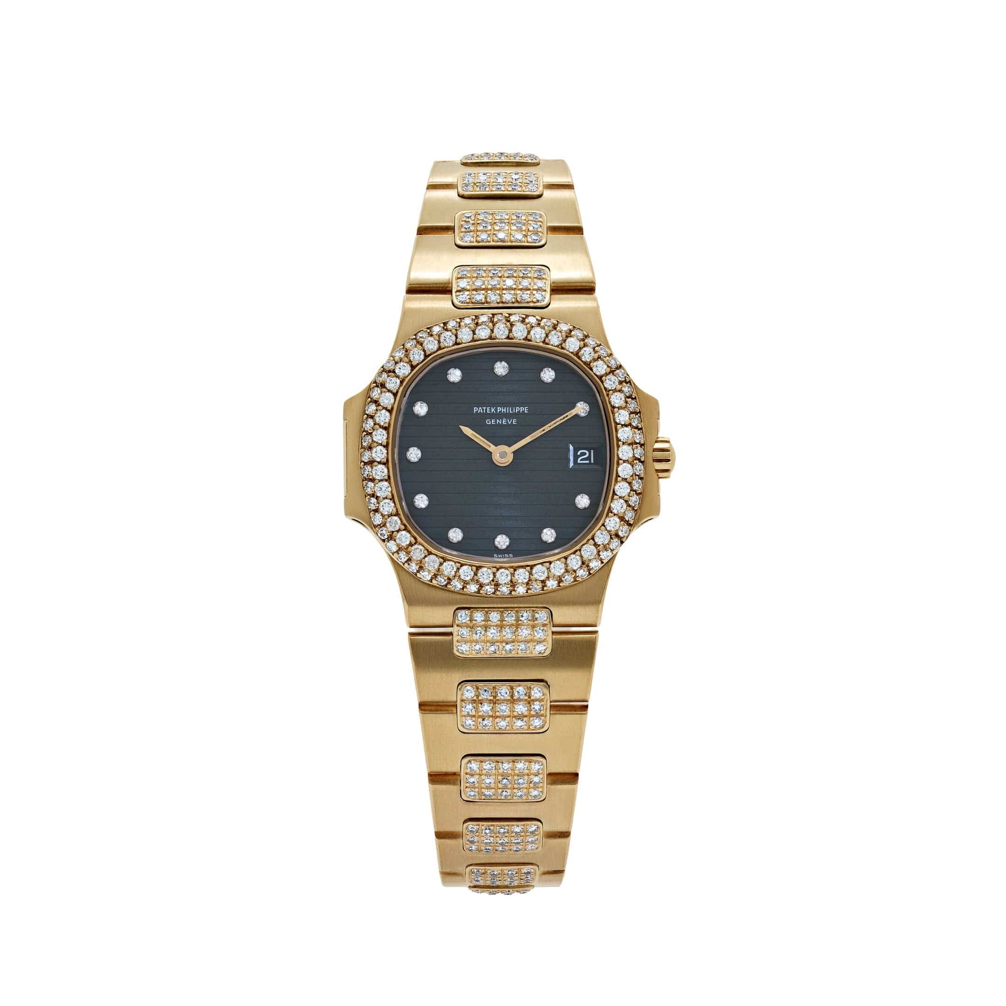 This particular version features a yellow gold case and integrated bracelet, paired with a striking blue dial where diamonds replace standard hour markers, and accented by diamonds on the bracelet—a layout that adds both sparkle and exclusivity. The horizontal embossed pattern on the dial offers subtle texture beneath the gem setting, while the slim profile respects dress-watch sensibilities. Though powered by quartz, its appeal lies in material richness, early Nautilus lineage and rare gem-set finishing—qualities that attract collectors drawn to watches with history, elevated material, and understated rarity.