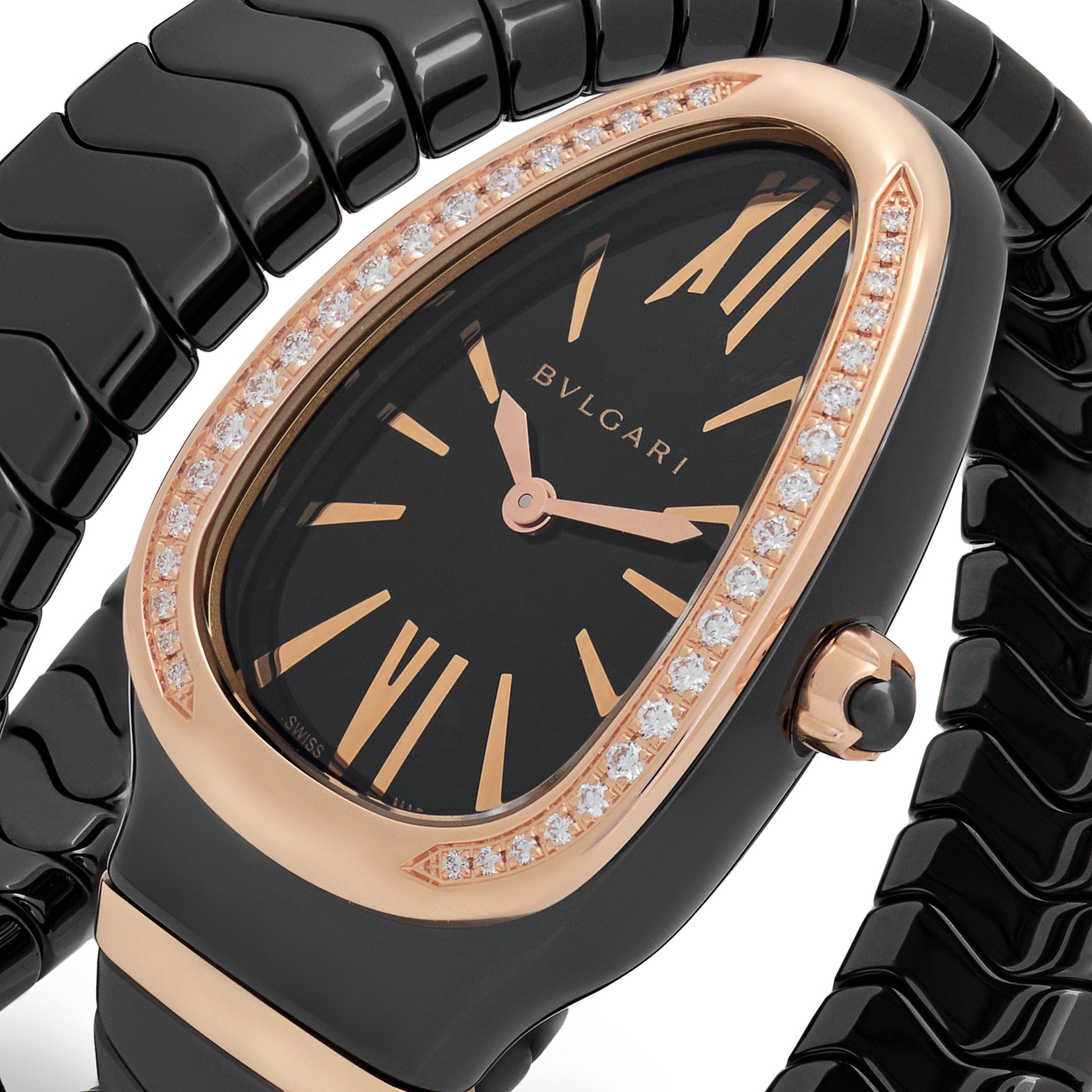 The BVLGARI Serpenti Spiga fuses timeless symbolism with contemporary luxury in its sinuous double-spiral form. This 35 mm quartz timepiece features a sculpted black ceramic case that mirrors the Serpenti’s coiled elegance, accented by a rose gold bezel set with brilliant-cut diamonds and a rose gold crown inlaid with a black ceramic cabochon. The high-gloss black lacquer dial underscores the minimalist design, while rose gold Roman numerals and sword-shaped hands provide clarity and striking contrast.