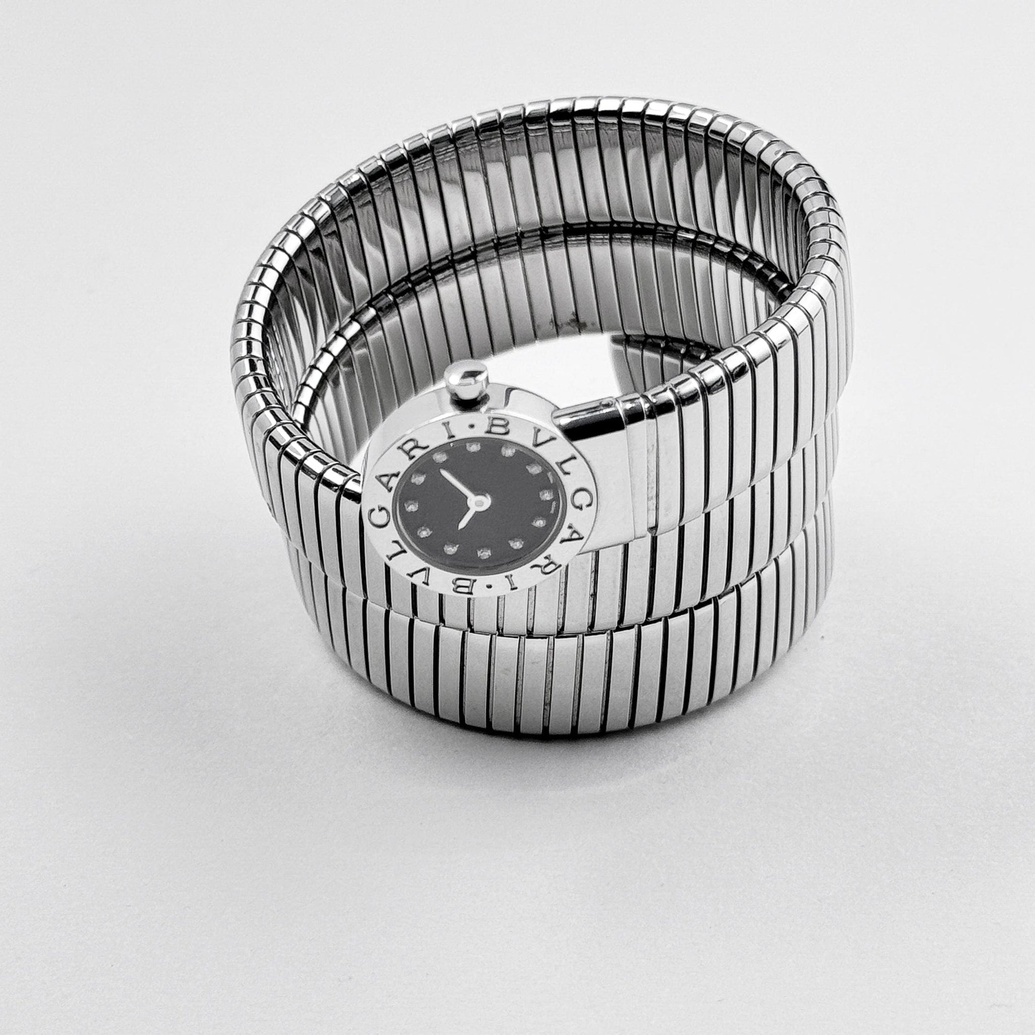 The BVLGARI Tubogas BB191TS 3 Row is a refined and contemporary timepiece that embodies BVLGARI’s unique approach to luxury watch design. Crafted from polished stainless steel, its iconic triple-row Tubogas bracelet wraps elegantly around the wrist, offering both comfort and a seamless, sculptural appearance. The watch’s 19mm case is perfectly proportioned, showcasing the signature double BVLGARI logo bezel.