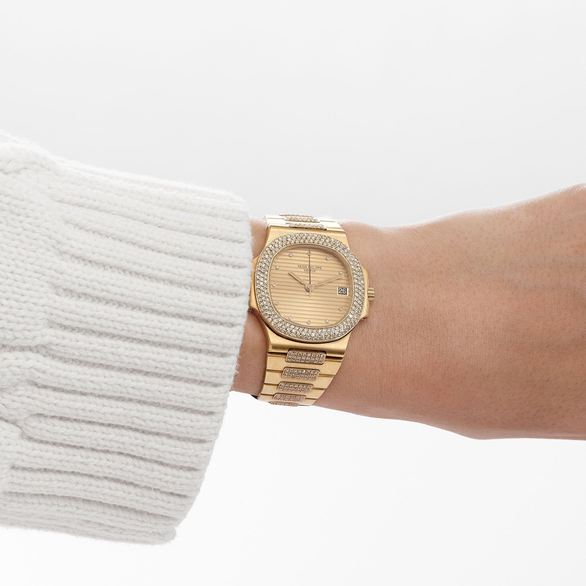 Powered by an automatic movement, this Nautilus reference offers reliable performance along with its unmistakable aesthetic. The intricate finishing of the case and bracelet, coupled with the brilliance of the diamond-set dial, makes the 3800/5 a sought-after collector’s piece. It perfectly balances the sporty charm of the Nautilus design with the elevated luxury of precious metals and gemstones, making it a truly distinguished addition to any watch collection.