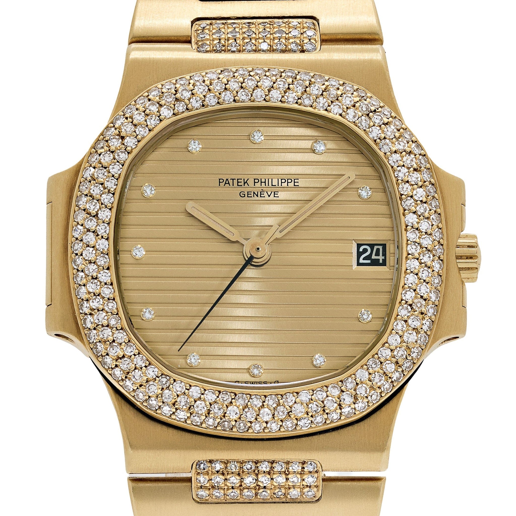 The Patek Philippe Nautilus 3800/5 is a captivating timepiece that embodies the sophisticated luxury and refined craftsmanship synonymous with the Nautilus collection. Its 37.5mm yellow gold case, with the iconic rounded octagonal bezel, harmoniously pairs with the integrated bracelet to create a seamless, elegant silhouette. The gilded gold diamond dial takes the design to the next level, featuring delicately placed diamond hour markers that shimmer against the rich golden backdrop, along with diamonds on the bezel and bracelet, exuding both opulence and timeless style.