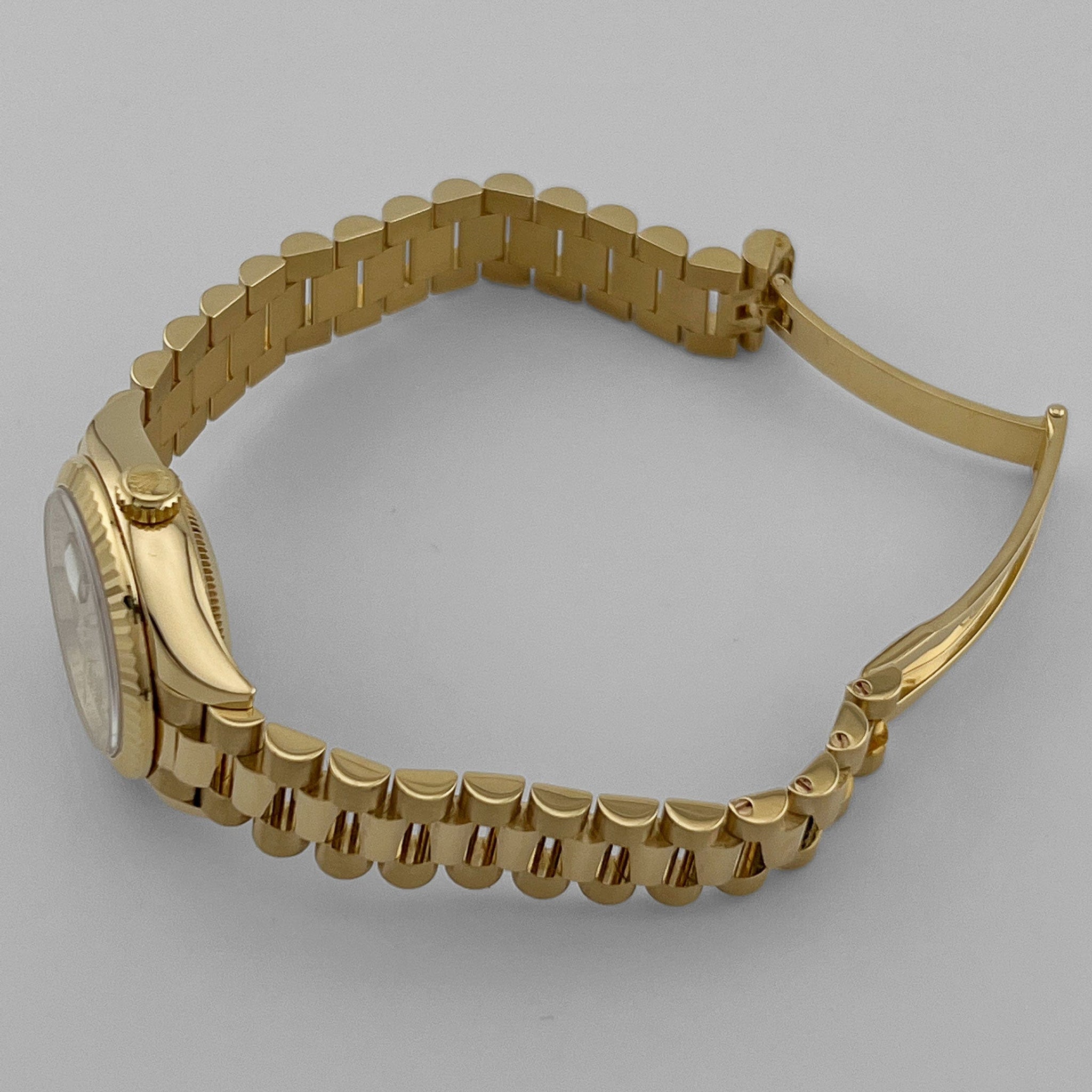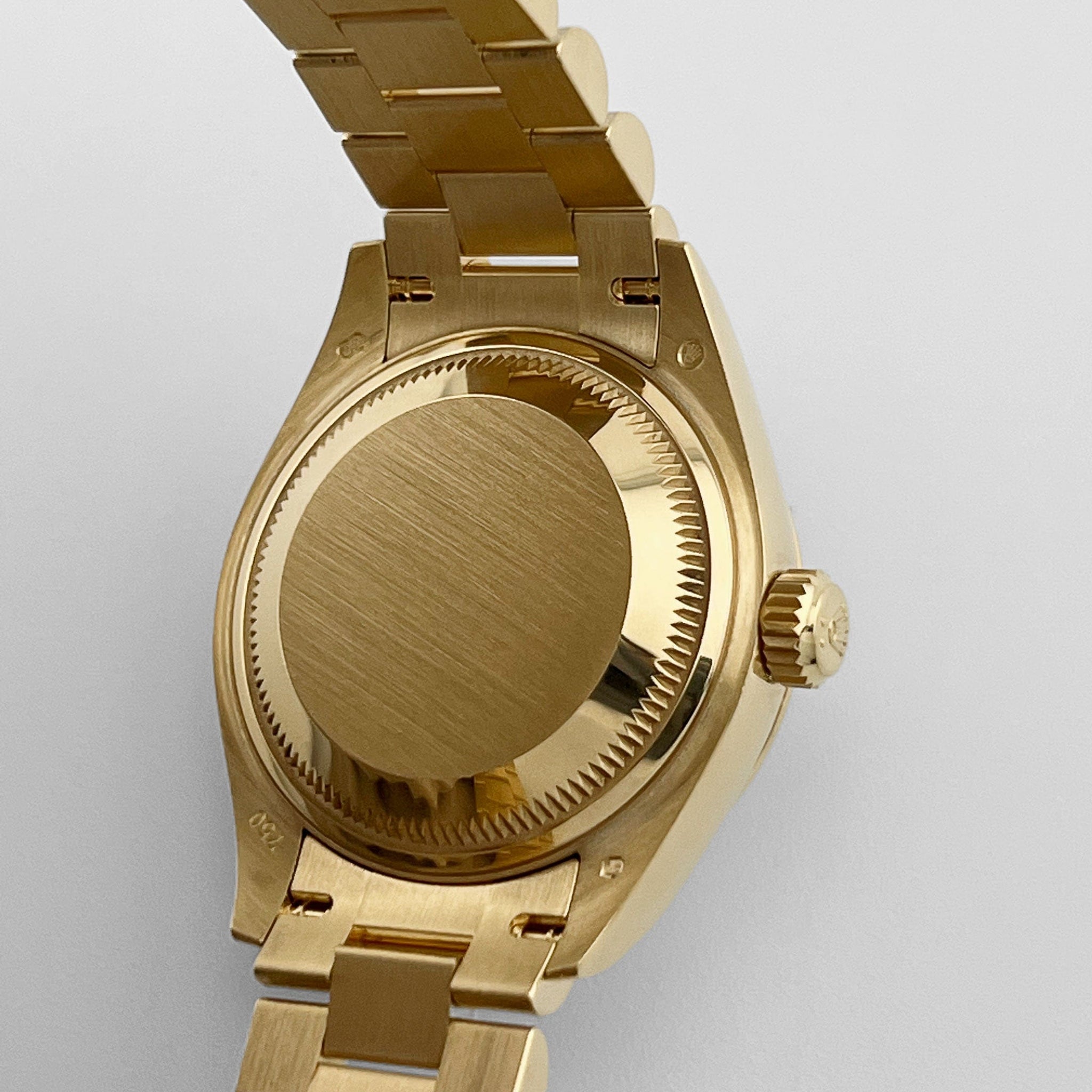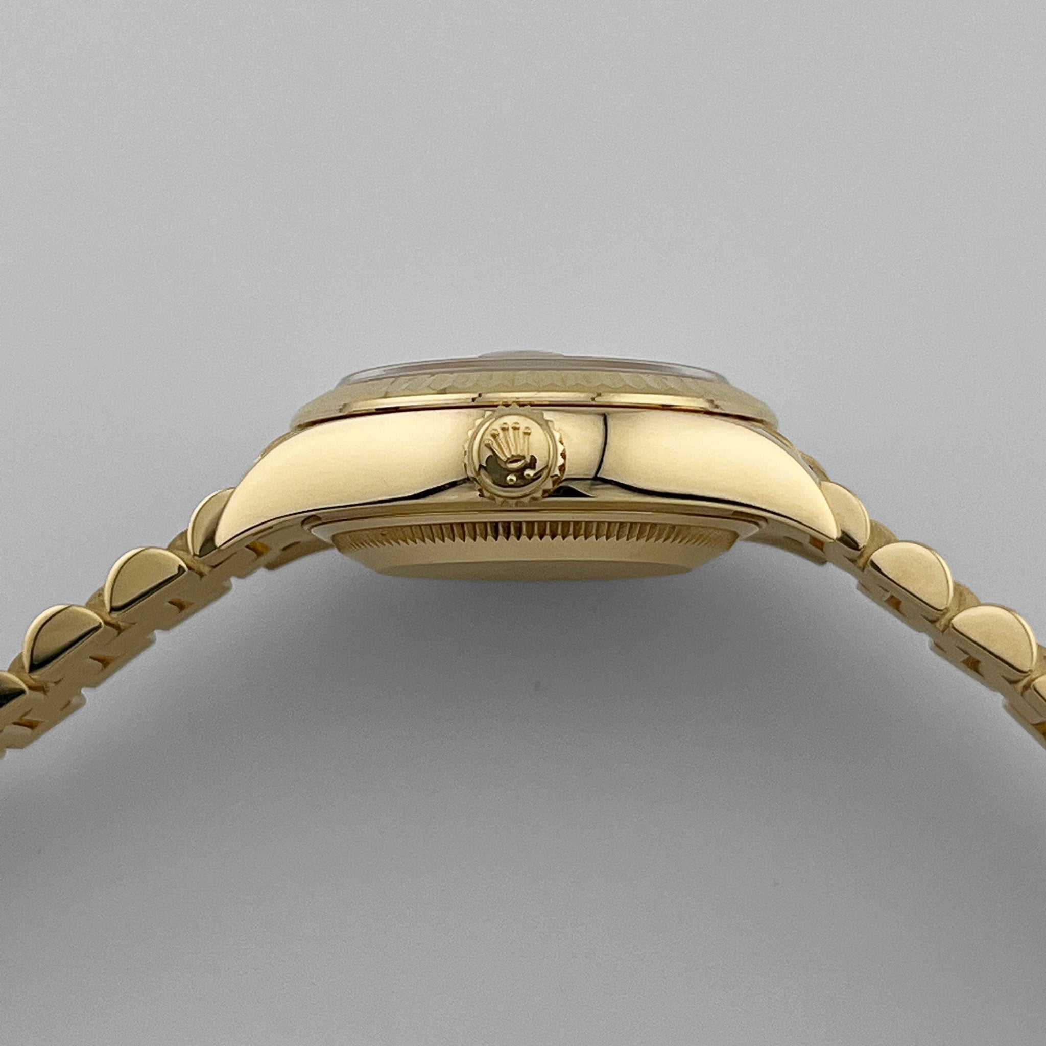 The Rolex Datejust 28 279178 radiates refined femininity through its 28 mm 18k yellow-gold case and classic fluted bezel. The silver dial is captivatingly detailed with nine star-shaped diamond hour markers and an ornate Roman numeral IX, set with eight tiny diamonds—each placed in exquisite yellow-gold settings that catch and reflect light beautifully. The layout centers around the familiar Rolex Cyclops date window at 3 o’clock, ensuring both charm and everyday readability. Fitted with a President-style bracelet, this model harmoniously blends opulence and elegance, with every polished link echoing the presentation of the watch face.