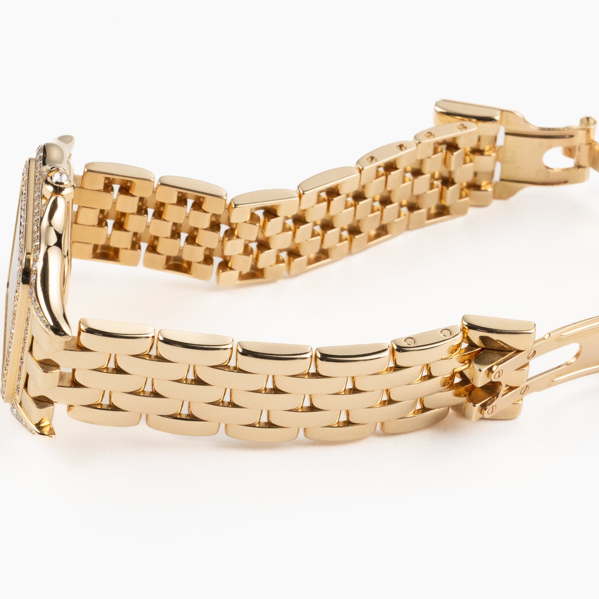 The Cartier Panthère 88369 in yellow gold with a diamond-set dial, case, lugs and bezel matters for its elegant marriage of fine jewelry craftsmanship and iconic Cartier watch design. With a 27mm case size and full yellow gold construction, it presents a compact yet unmistakably luxurious wrist presence that blurs the line between timepiece and high jewelry.