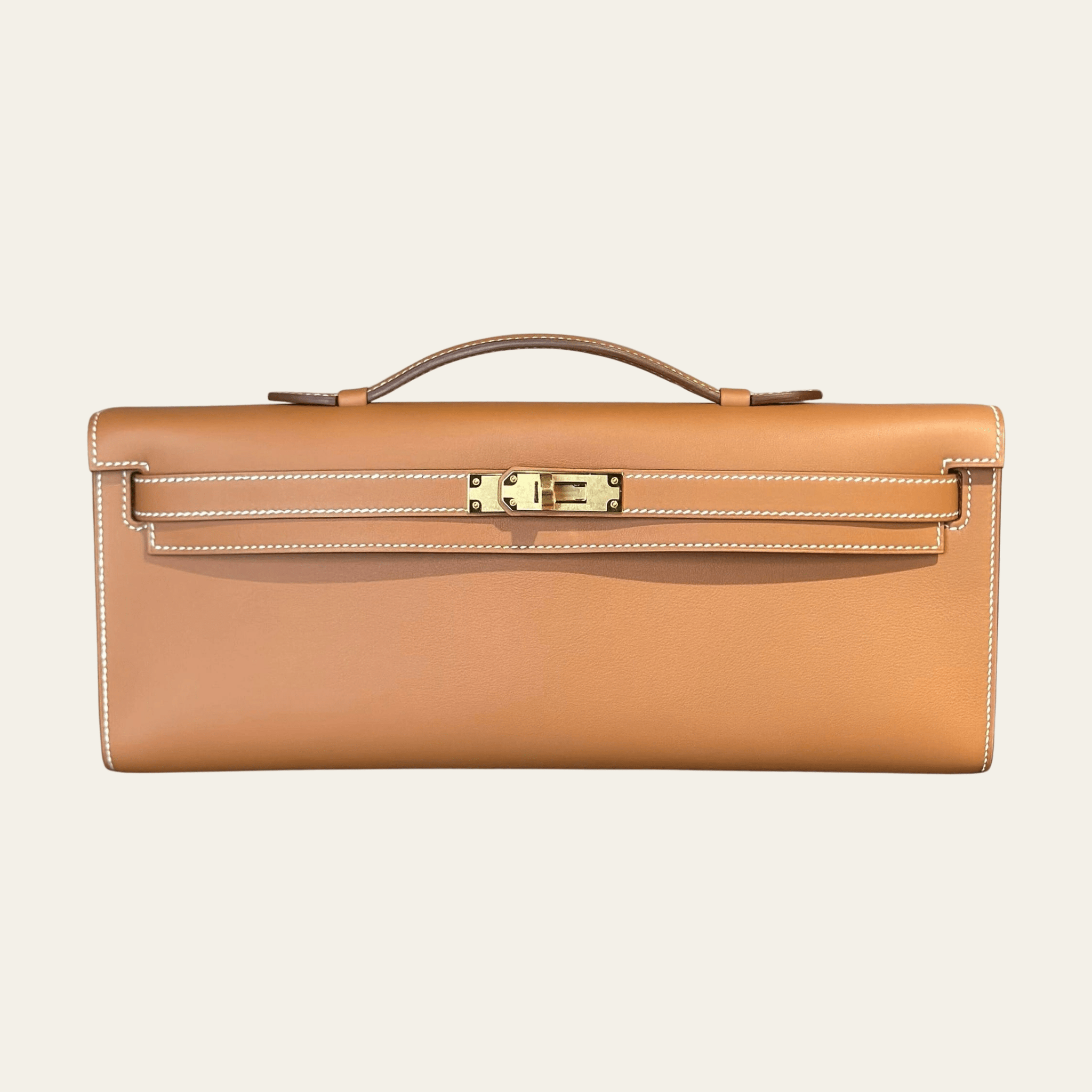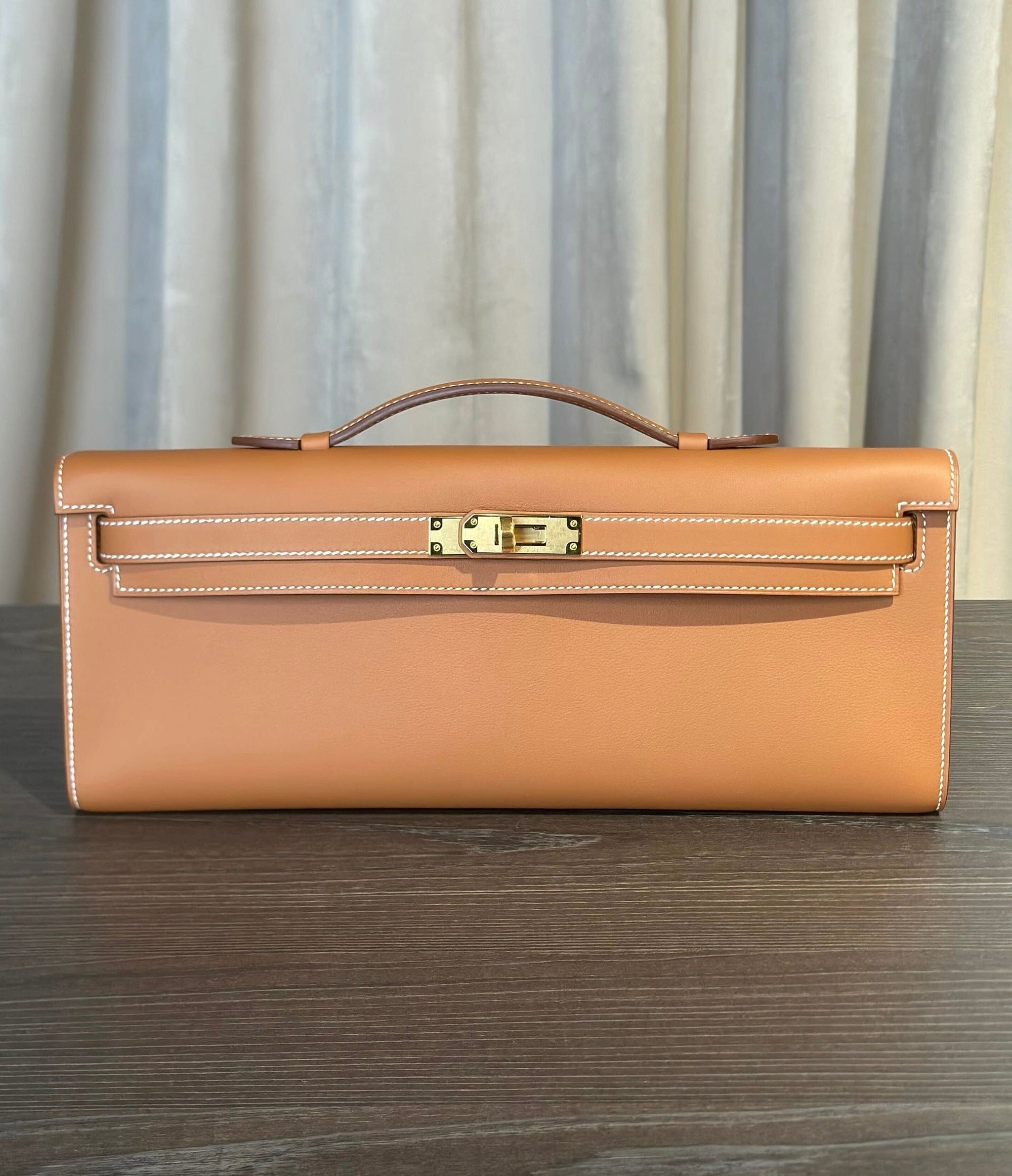 This Hermès Kelly Cut in Gold Swift leather is an elegant evening bag that reimagines the classic Kelly in a sleek, elongated silhouette. The Gold shade—a warm brown, one of Hermès’ most iconic neutrals—is paired with contrasting white stitching, highlighting the refined craftsmanship of the piece. Crafted from Swift leather, it offers a smooth texture and soft sheen, bringing out the richness of the color while providing a supple, luxurious hand feel.
