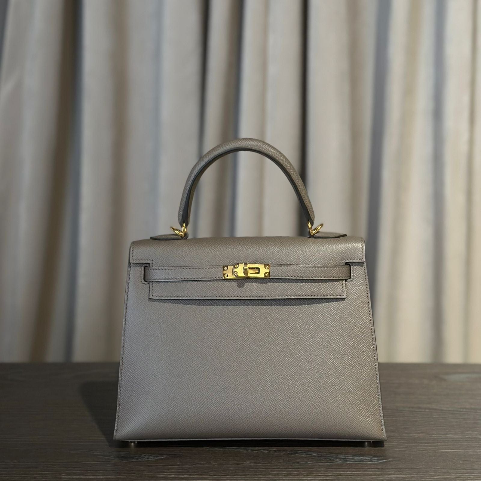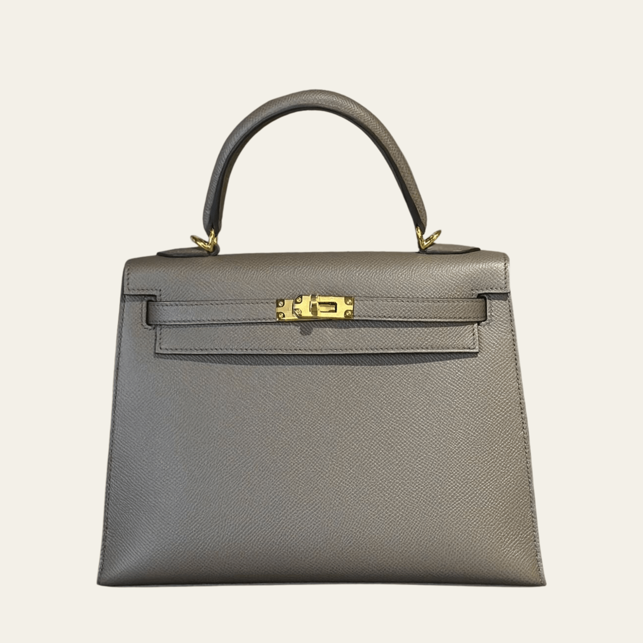 Finished with gold hardware (GHW), this grey Kelly 25 Sellier exudes sophistication with a warm metallic contrast that elevates the muted grey tone. The Sellier construction, with its external stitching and sharp edges, creates a polished, architectural profile that feels more formal and commanding than the relaxed Retourne style. Compact yet practical, the Kelly 25 strikes the perfect balance for both daywear and evening elegance.