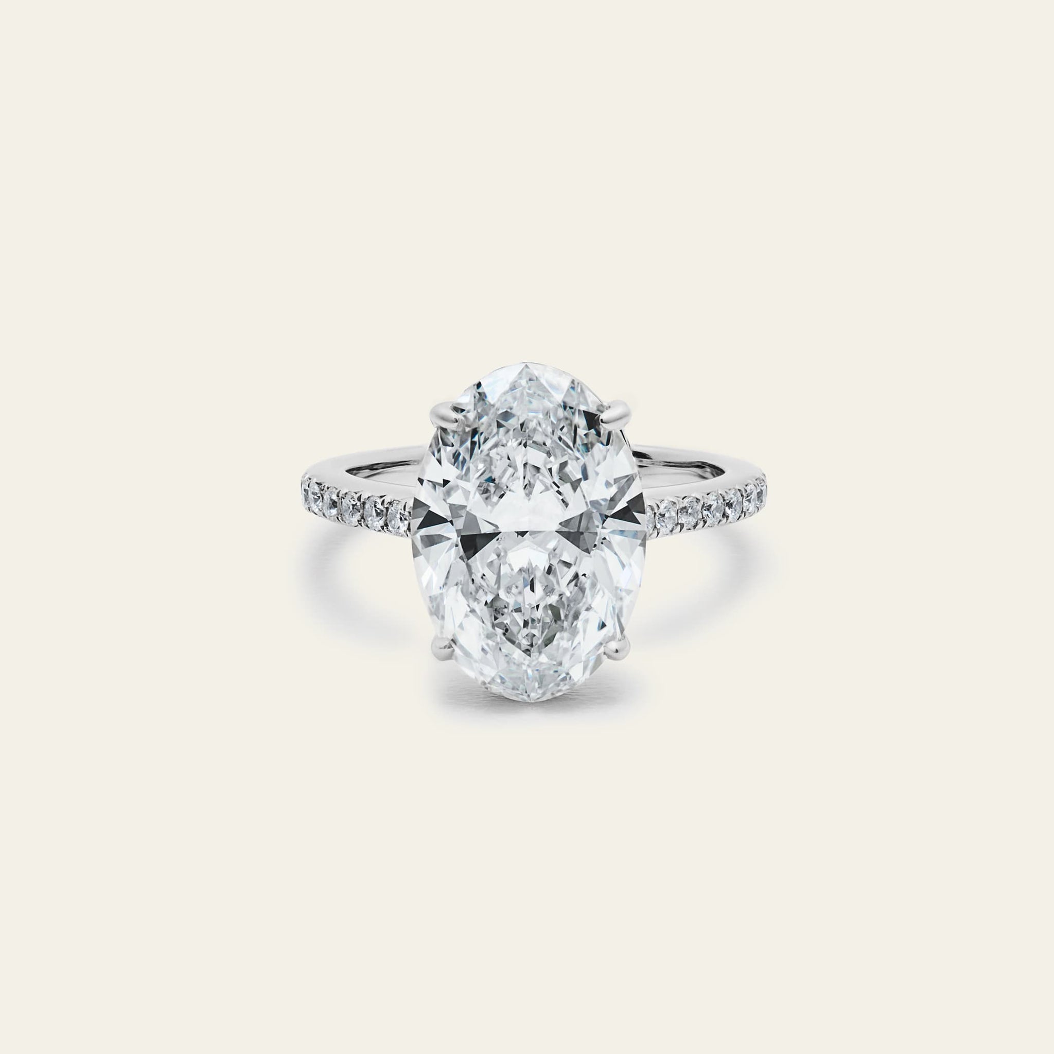 A striking oval diamond ring featuring a brilliant oval cut center diamond set in a refined combination of platinum and 18K white gold. The ring showcases a delicate pavé diamond band that enhances the center stone’s brilliance while maintaining a clean and elegant silhouette. Designed as a modern interpretation of the classic oval diamond engagement ring.