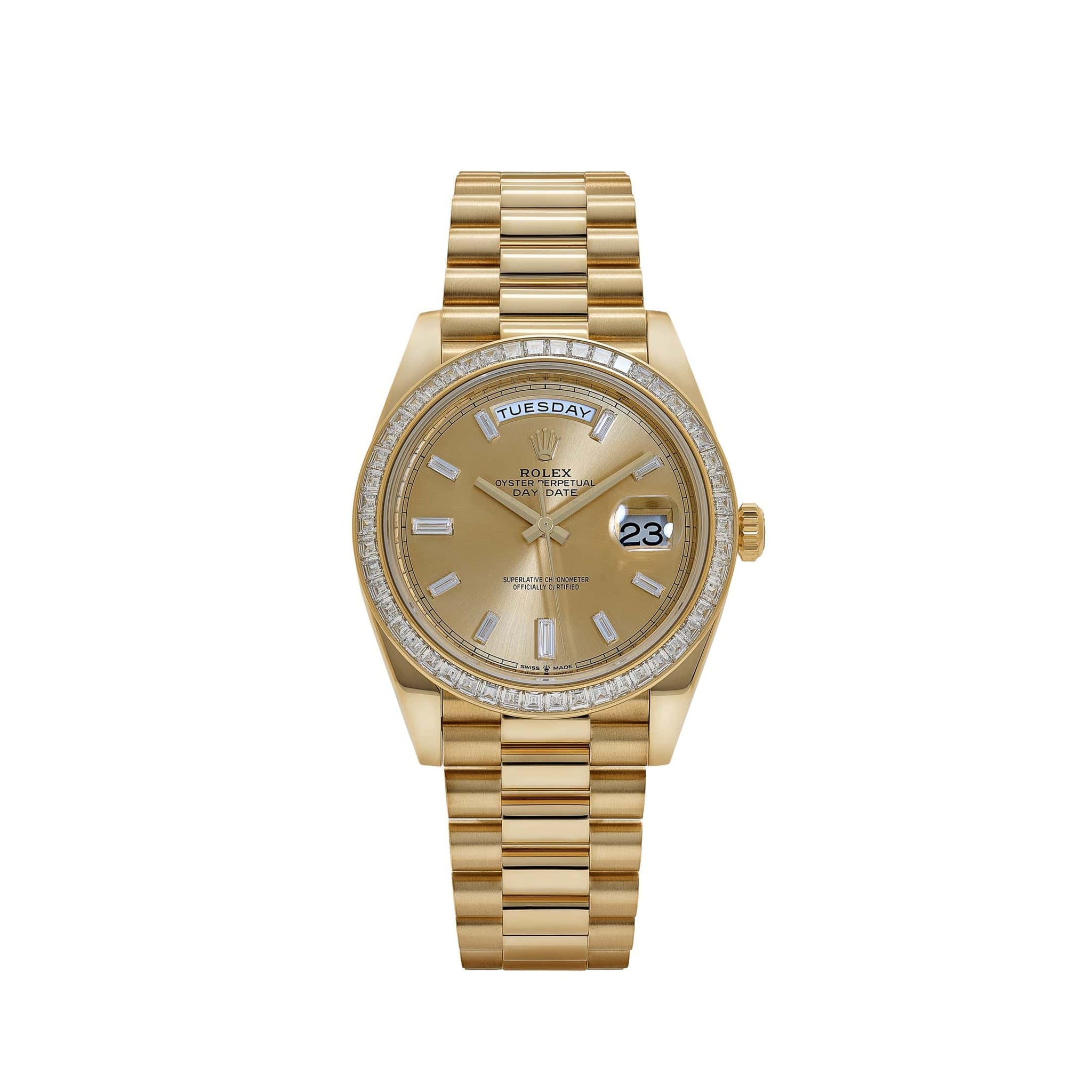 The Rolex Day-Date 40 228398TBR pairs Rolex’s flagship dress-watch silhouette with an elevated high-jewelry expression, combining a 40 mm yellow gold case with a champagne diamond-baguette dial and a matching diamond-baguette bezel — giving it rare visual presence while preserving the Day-Date’s timeless form. The rich champagne backdrop enhances the sparkle of the carefully arranged diamonds, creating a warm, refined contrast against the yellow gold that feels both luxurious and wearable.